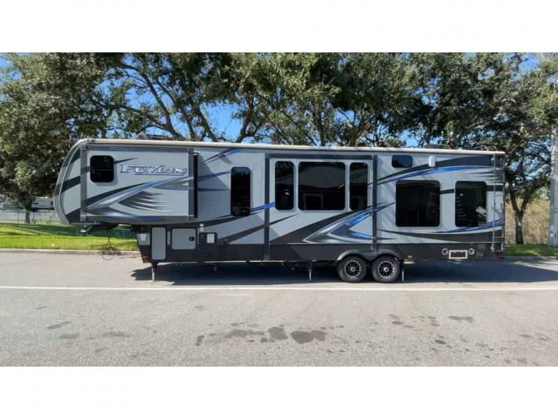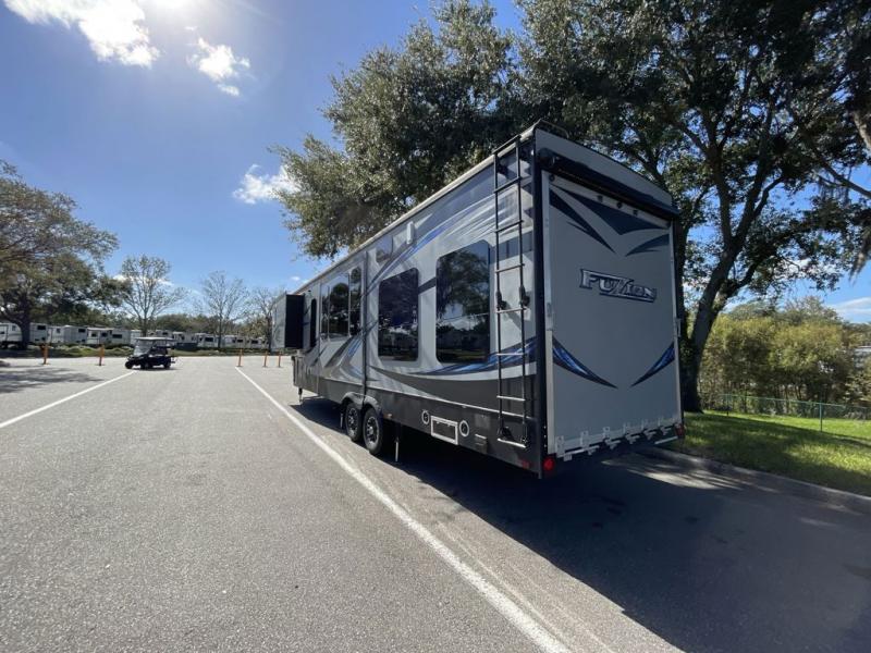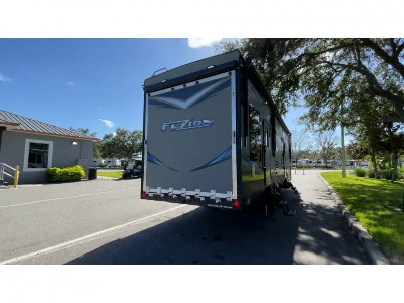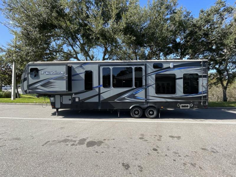 This Keystone Fuzion fifth wheel model 325 has room for your toys, your family, and a few extra friends! Enjoy double slide outs for added interior space, dual entry doors plus an eight foot garage ramp door for easy loading and unloading, and all the amenities of home.