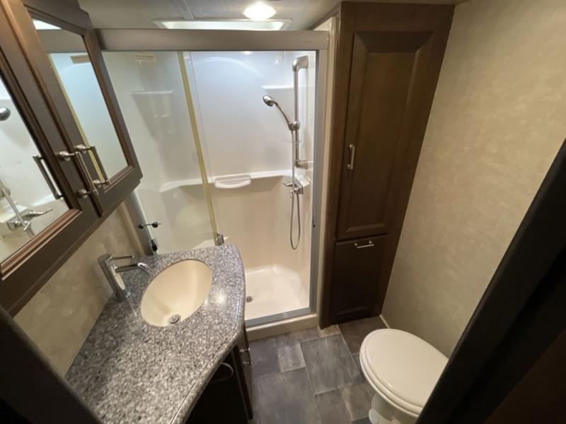 Continue on to the bedroom through a sliding door. To the left there is a wardrobe slide out with storage drawers for all of your things. A residential queen bed with a Fuzion king option available also. Enjoy nightstands on both sides of the bed, an overhead cabinet, and a flat screen TV, plus so much more!