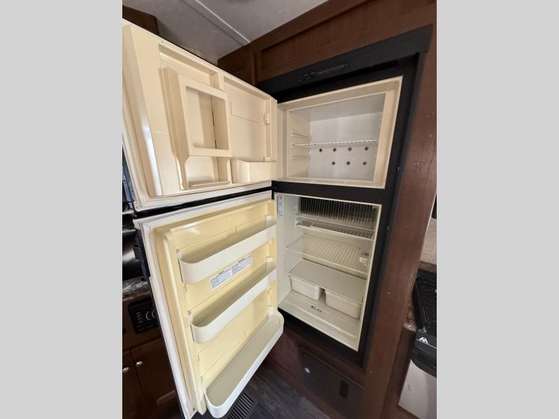 In the kitchen find all the necessary appliances to create tasty treats for your family as you travel. There is a refrigerator, three burner range, and double kitchen sink. The pantry allows for storage of your canned goods.