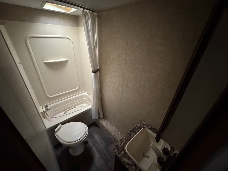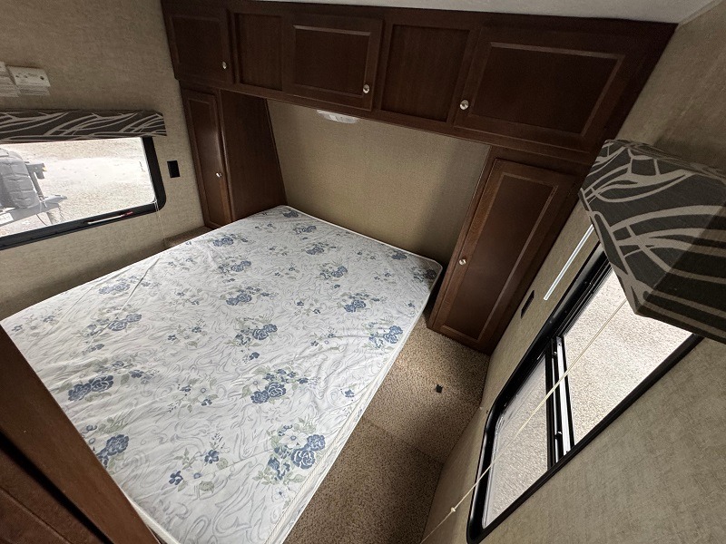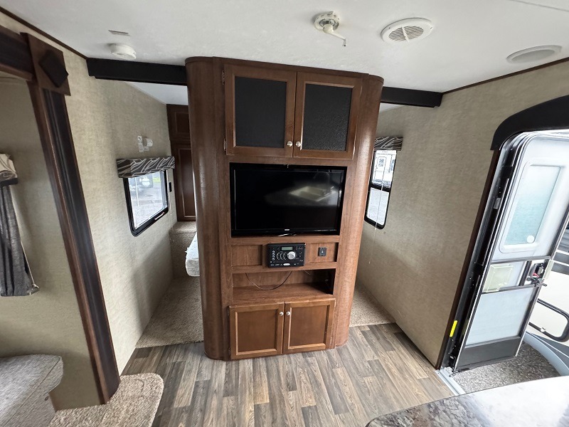 Step inside and find a front bedroom with dual entry doors, one on either side of the entertainment center that is just off the foot of the bed. The entertainment center features a swivel TV for multiple room viewing, including the bedroom! Inside find also a queen size bed with closets on either side, plus overhead storage too. The sliding doors allow for more privacy at night when they are closed.