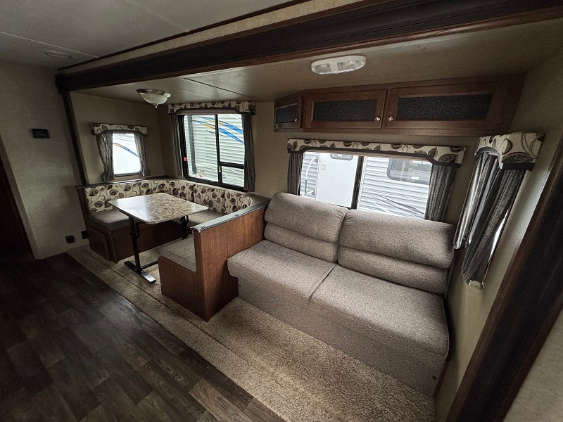 Straight in from the side entry door there is a slide out sofa with overhead storage and a u-shaped dinette. You can choose to add a tri-fold sofa allowing you to easily make both into additional sleeping space for overnight guests.