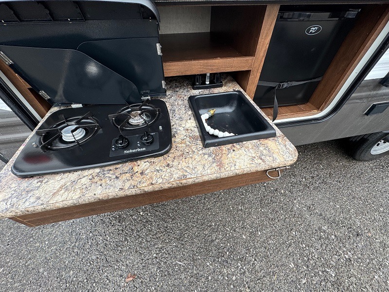 Check out the outdoor camp pull-out kitchen with slide out two burner cook-top, and single sink with slide out counter and refrigerator too. You will also love the front outside pass-through storage compartment, and so much more!