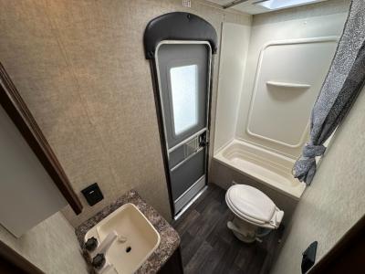 Along the back there is sleeping for four with double bed bunks in the right rear corner. A ladder is included for easy access to the top bunk. The rear left corner offers convenient bath amenities including a tub/shower, toilet, and sink, plus private entry for easy access when enjoying the great outdoors!