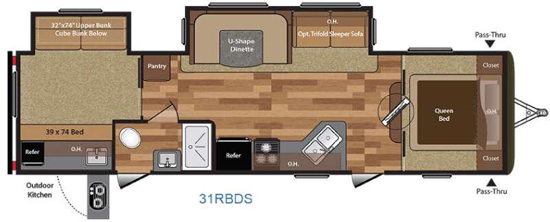 The main combined kitchen area and living room features a large slide out u-shaped dinette and sofa with overhead storage. You can choose the tri-fold sleeper sofa if you like.
