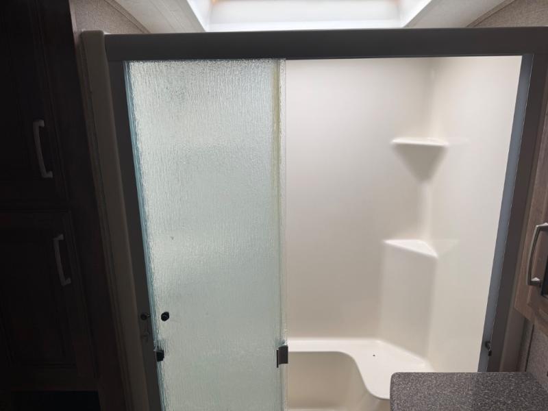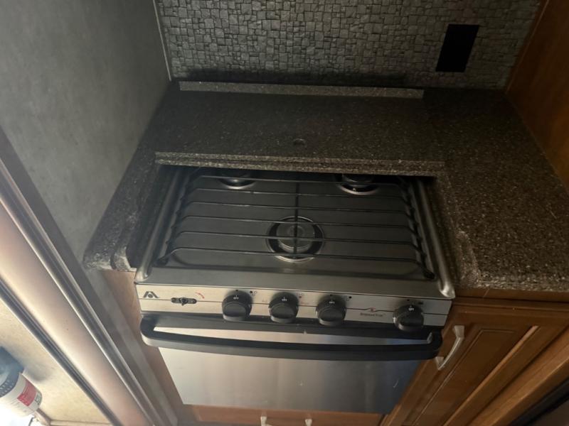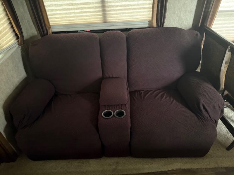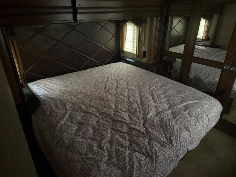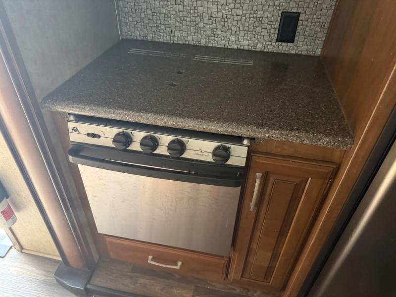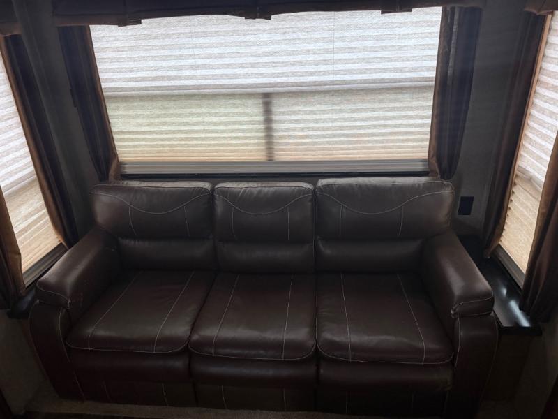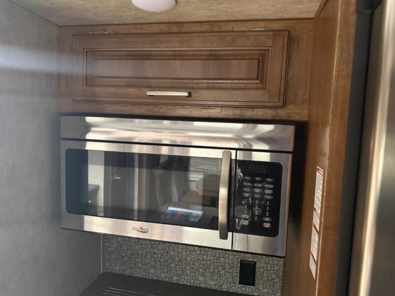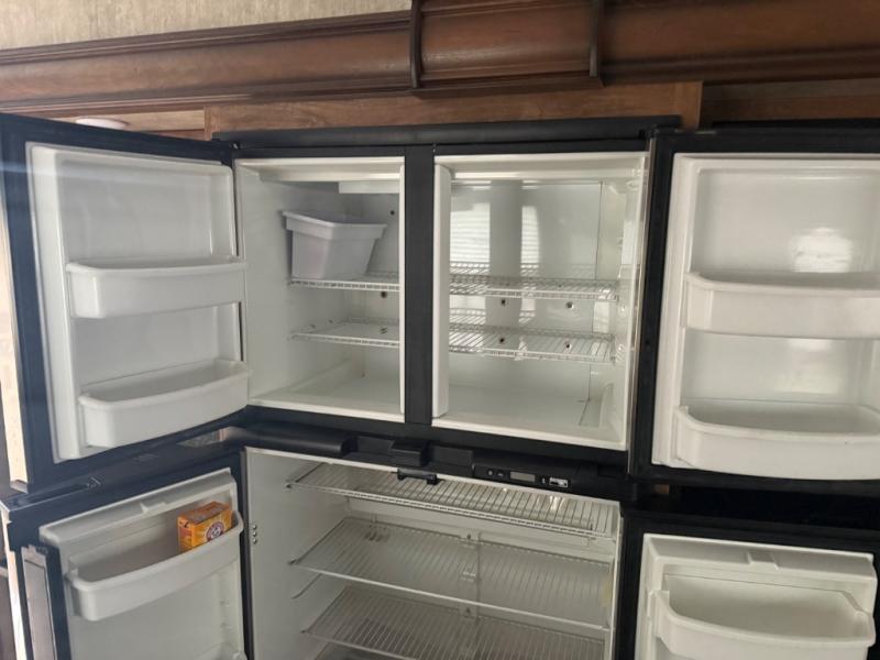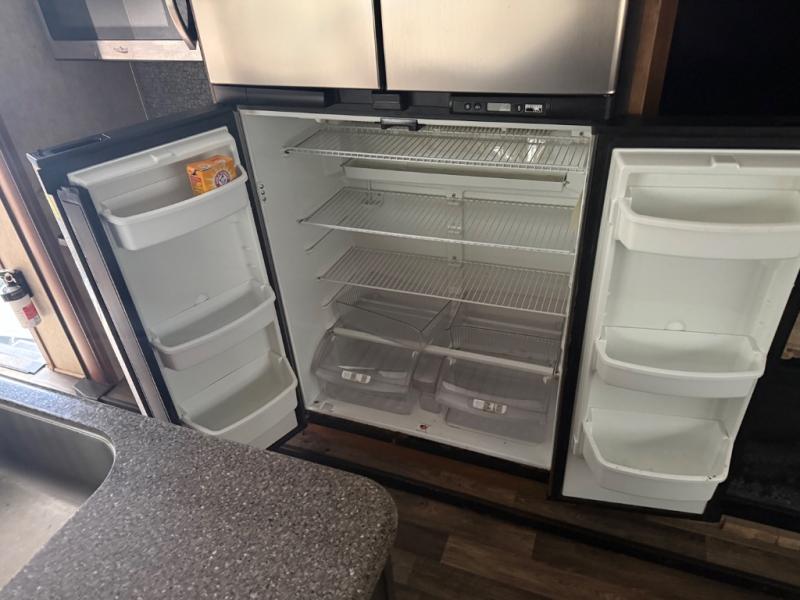 Step inside and see a spacious gathering place to the left of the door. There are dual slides that offer increased floor space giving you an at-home feel. There is a three burner range with convection microwave oven, a double door refrigerator, and an entertainment center with HDTV and fireplace in the slide out to the left of the entry door. You will also find a convenient kitchen island that offers counter food prep space and double sinks for cleaning up. The overhead cabinets, and lower cupboards and drawers will make storing your dishes easy too.