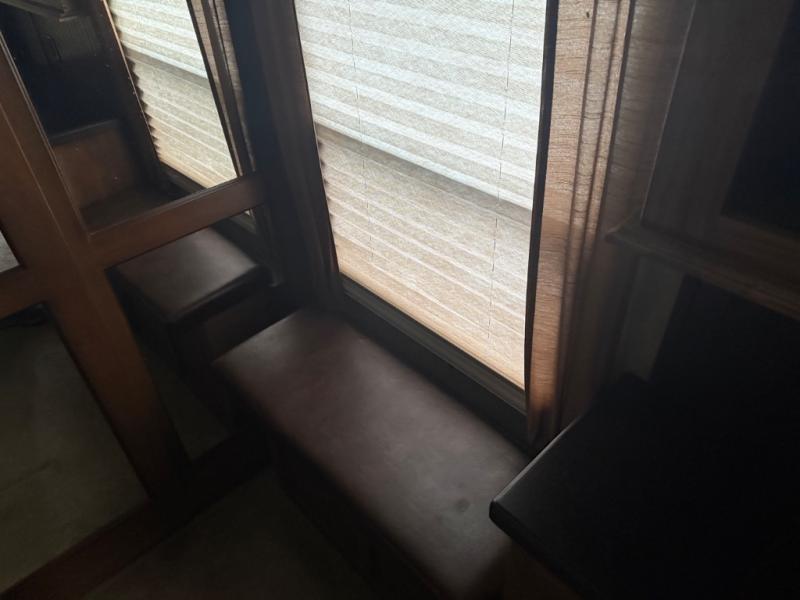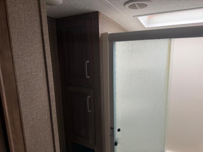 The slide opposite the door features a dinette with two chairs, and optional theater seating for two with cup holders and overhead cabinets the entire width of the slide.