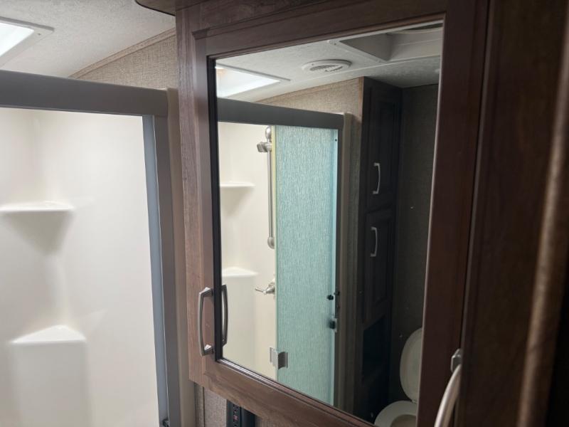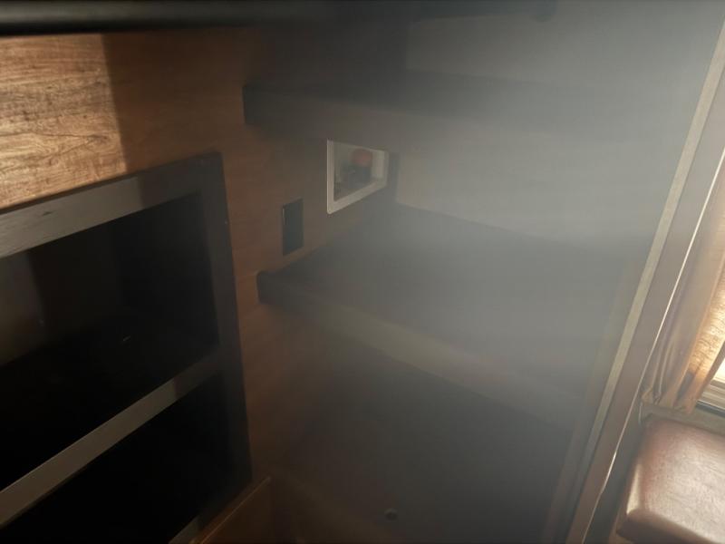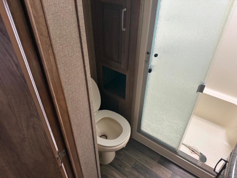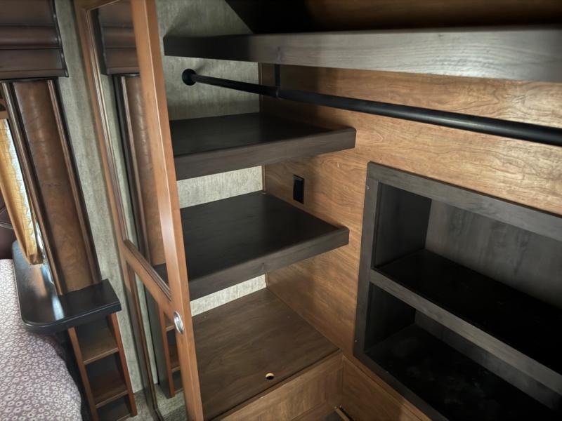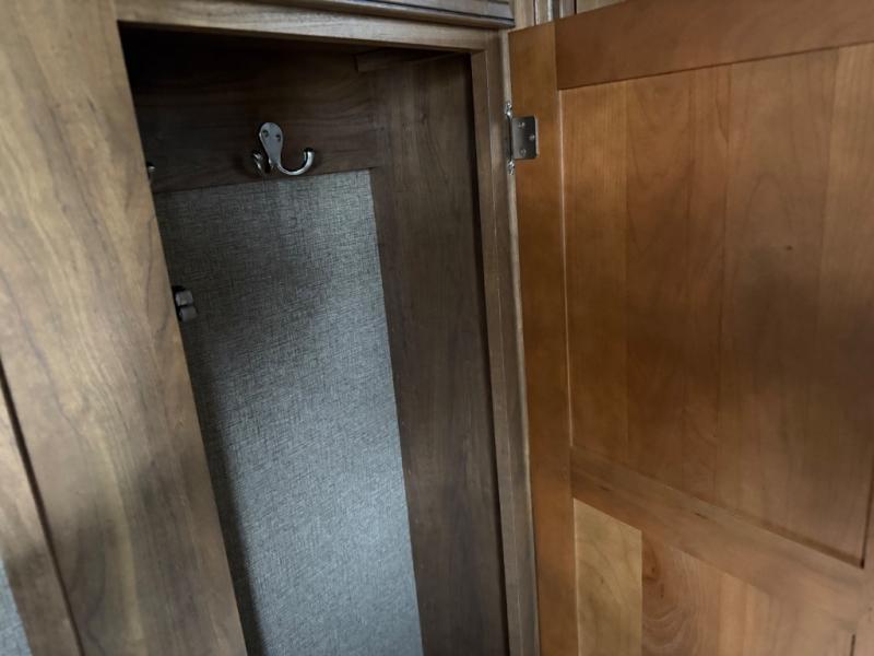 The front master bedroom provides ample space and a comfortable queen or optional king bed slide out. You will enjoy storage beneath the bed for extra things like blankets, or larger items like suitcases and things. You will also find a dresser opposite the bed with an HDTV above, plus a seating area along side. The front wall features a center wardrobe with space on either side that has been prepped for a washer and dryer.