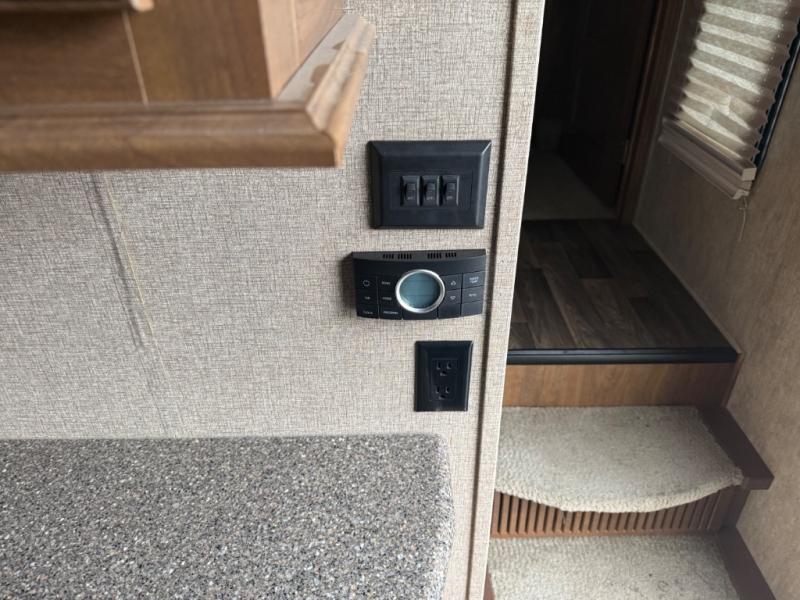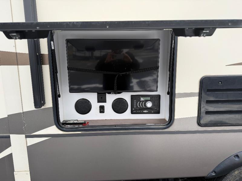 On the outside enjoy storage, an outdoor entertainment center, and two awnings. One 18' awning covers the main entry door, and a smaller awning covers the door side slide giving you a large outdoor protected space from the elements to enjoy, plus so much more!