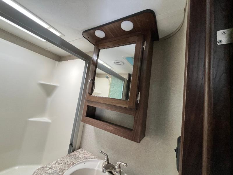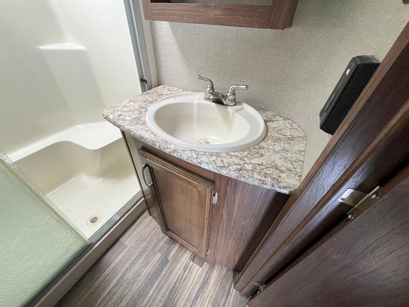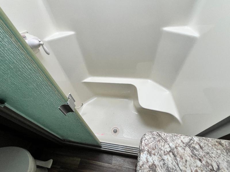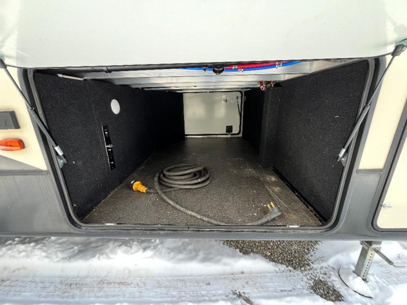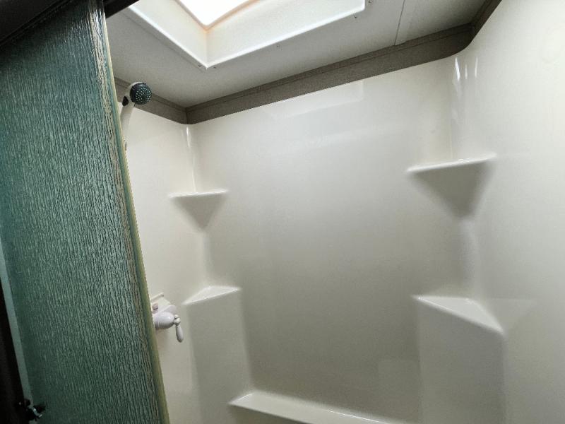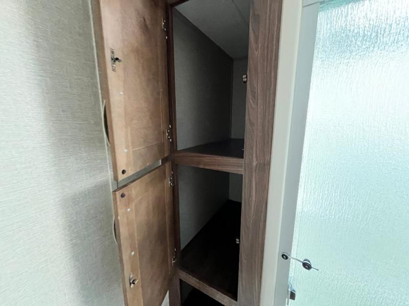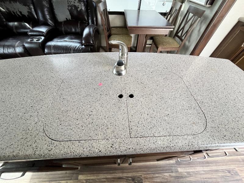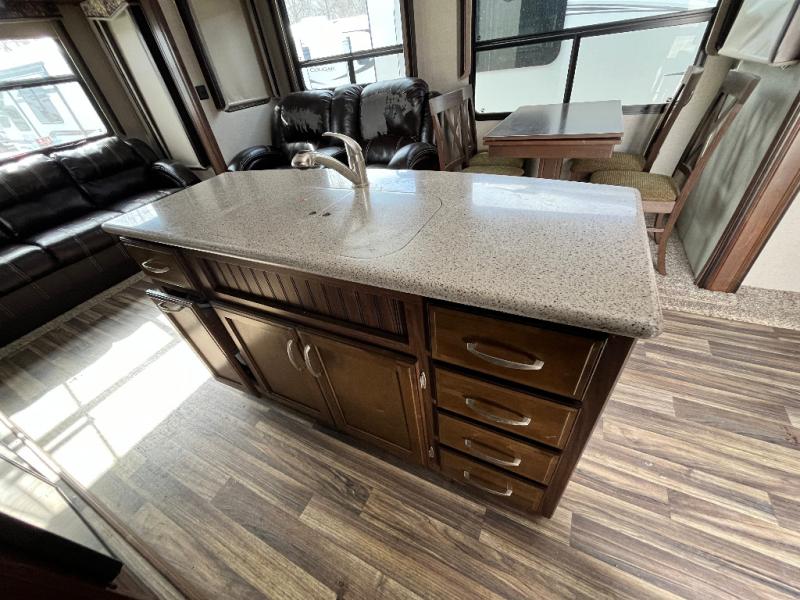 Upon entering 305RL you will see the kitchen amenities to your immediate left with a slide out three burner range, refrigerator, and pantry. There is also a entertainment center within this kitchen slide featuring a HDTV and optional fireplace. The kitchen island features a double sink and provides additional counter space as well. There is a convenient hutch located along the interior wall straight in from the entry door for more storage needs.