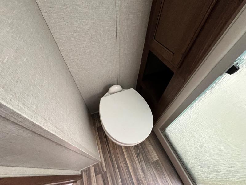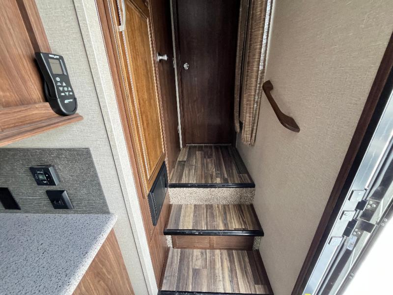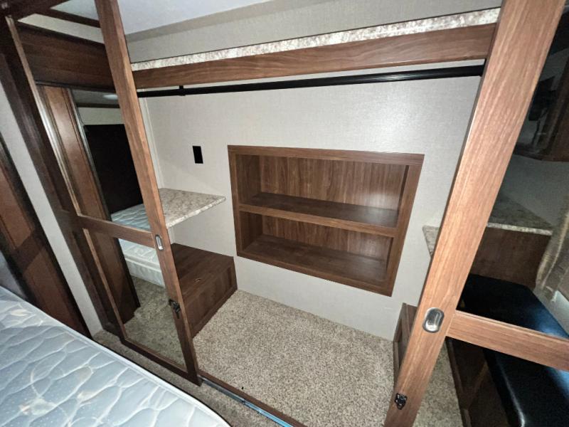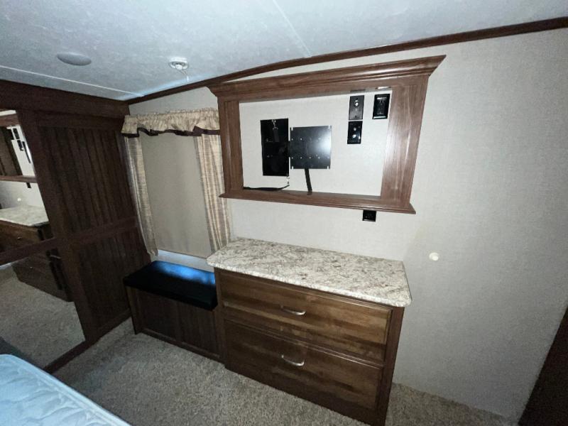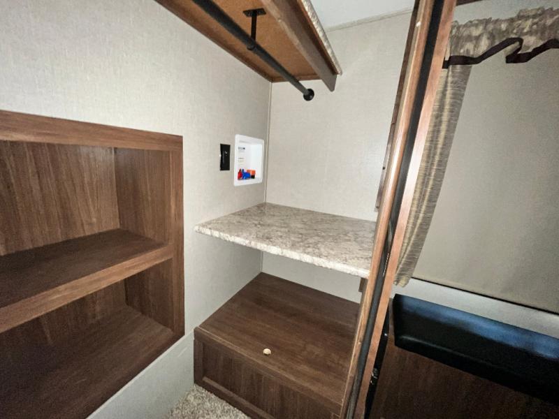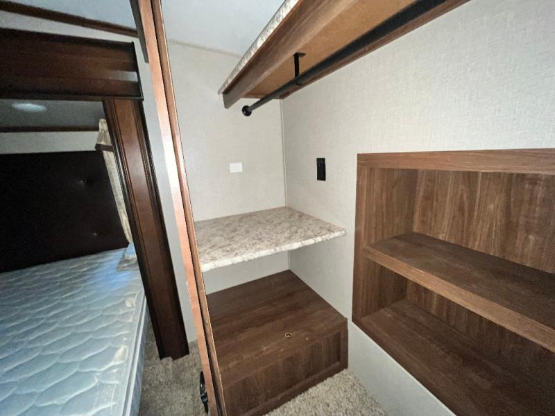 Continue to the end of the hall into a private front bedroom with queen slide out bed, or optional king if you enjoy a bit more space to sleep. There is also a dresser opposite the bed with an HDTV above, and a wardrobe for clothing storage with space prepped for a washer and dryer on either end of the wardrobe, plus so much more!