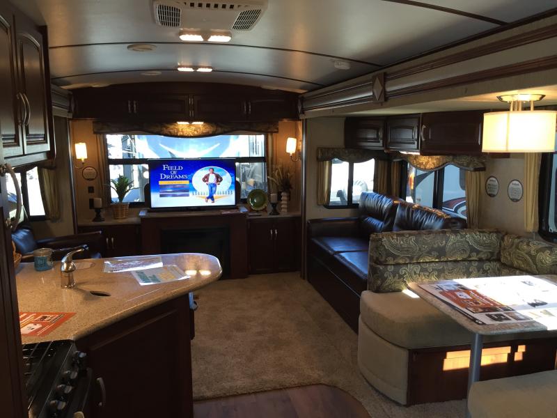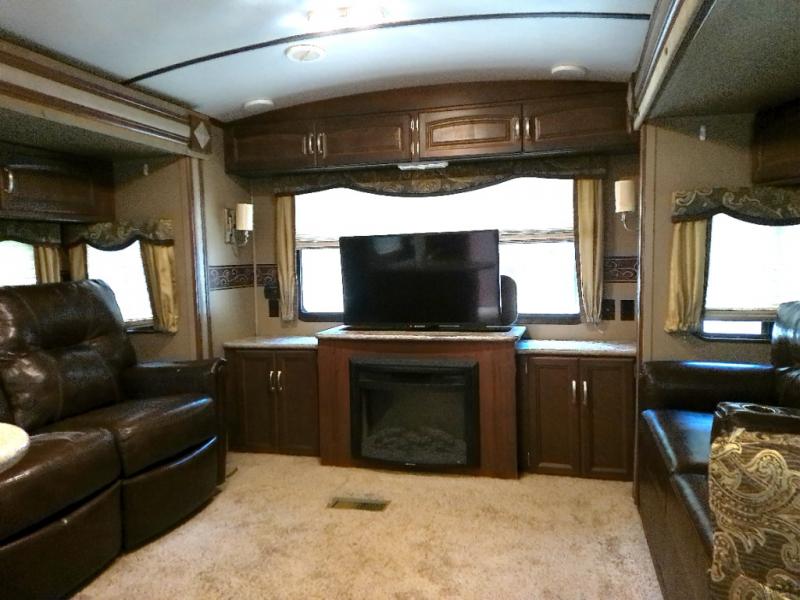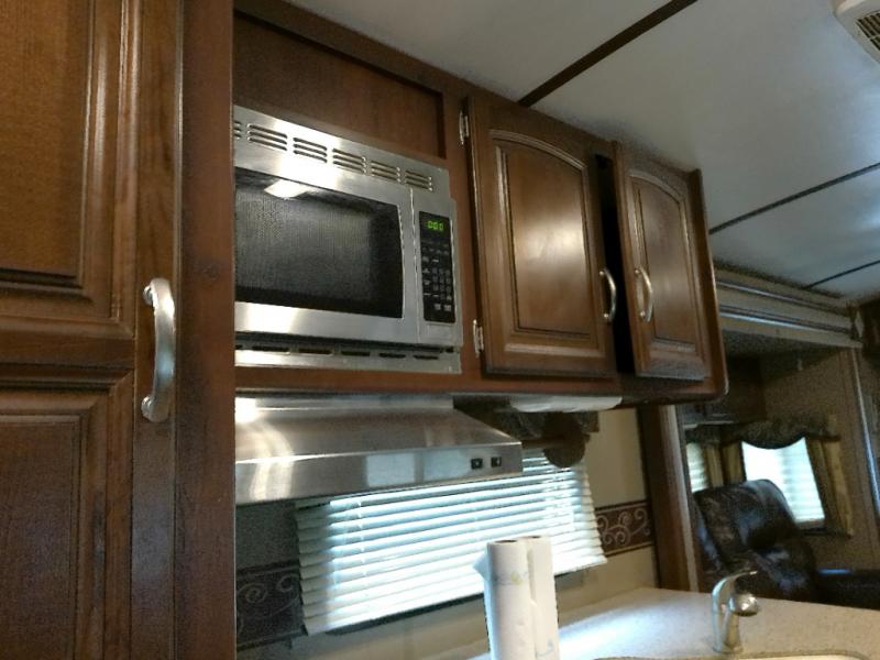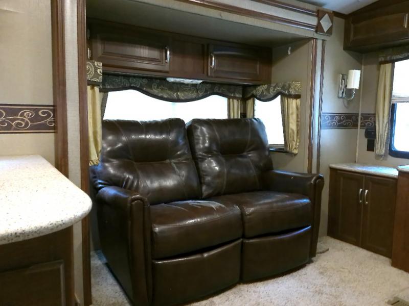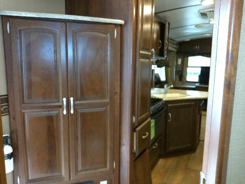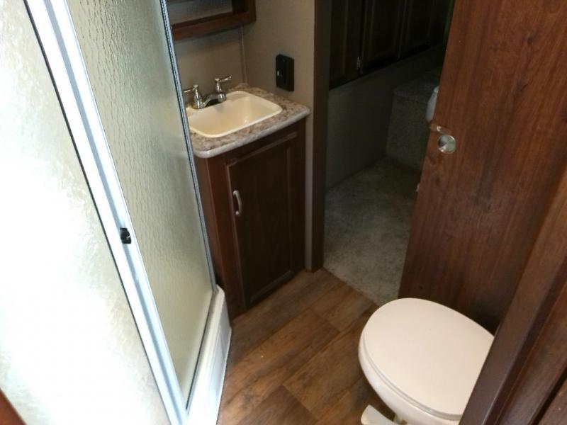 What I liked most: Very open feel rear entertainment living area with theater seating on one side and sulfur on the other side with opposing slide outs. Large storage drawers under kitchen counters. Shower has plenty of headroom. Outside there is a small cook stove and sink that pops out.