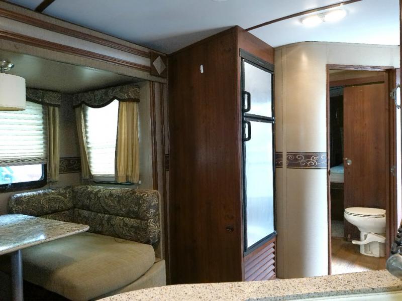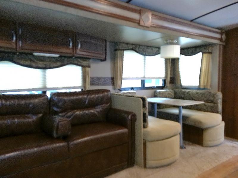 As you make your way to the open living area notice the rear wall entertainment center with overhead cabinets, and pop-up LCD TV. There are also storage cabinets below for your things. You can easily enjoy conversations or television watching from the theater seating in the slide to the left looking back, or from the sofa sleeper with overhead cabinets in the slide on the right which also includes a nice booth dinette for dining.