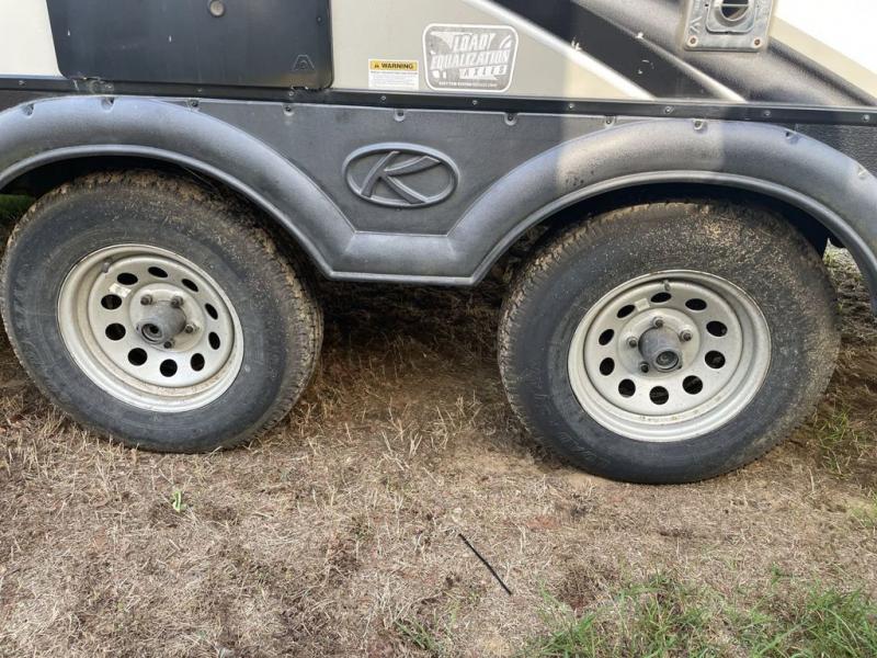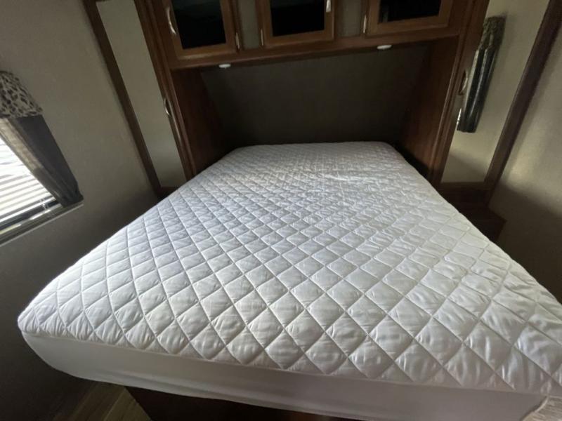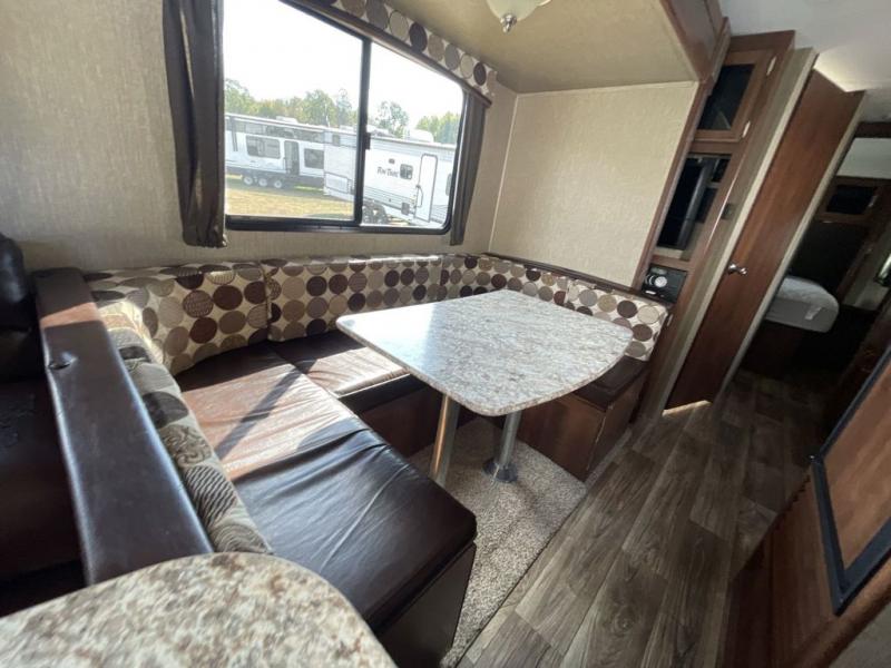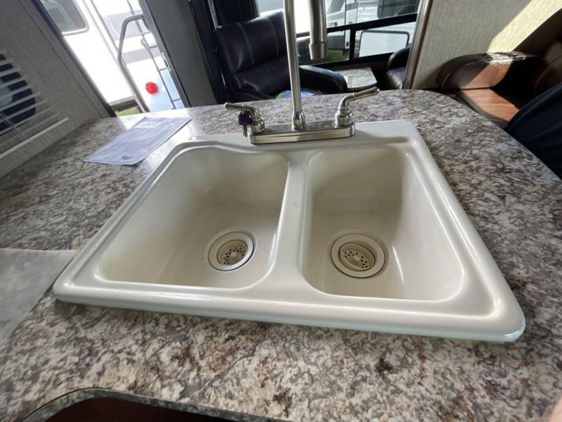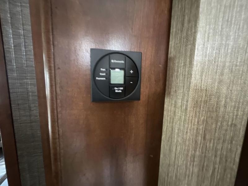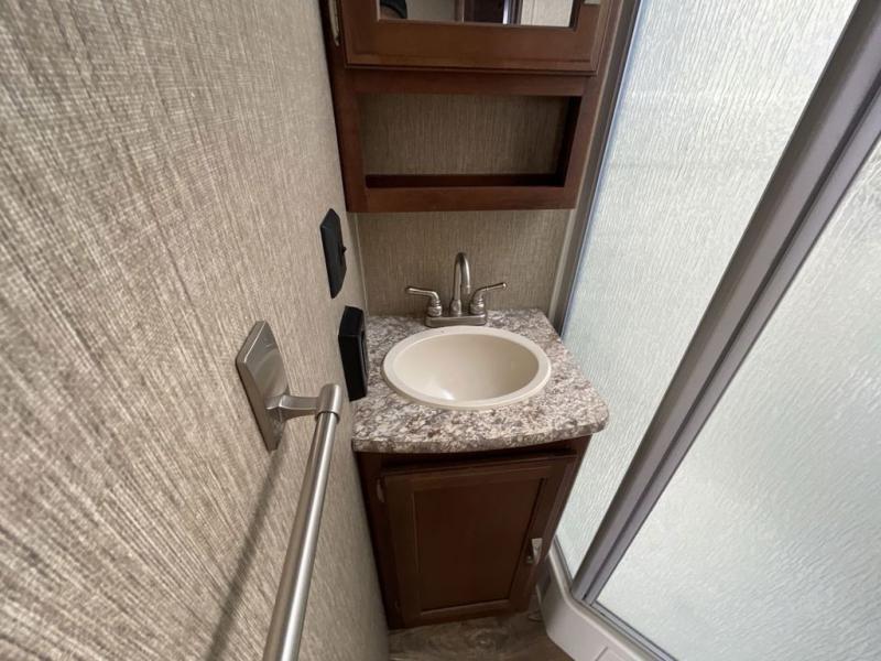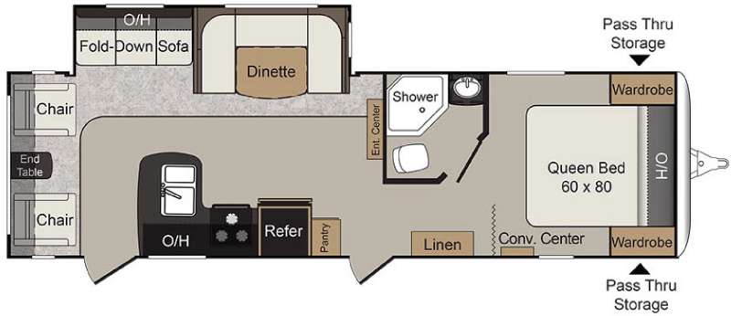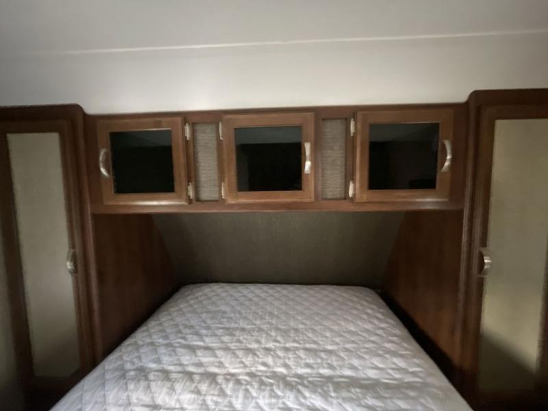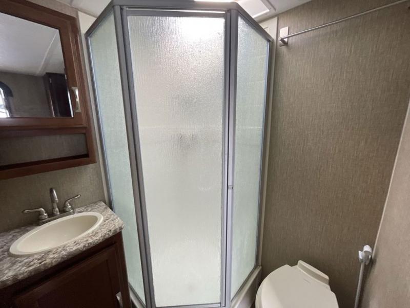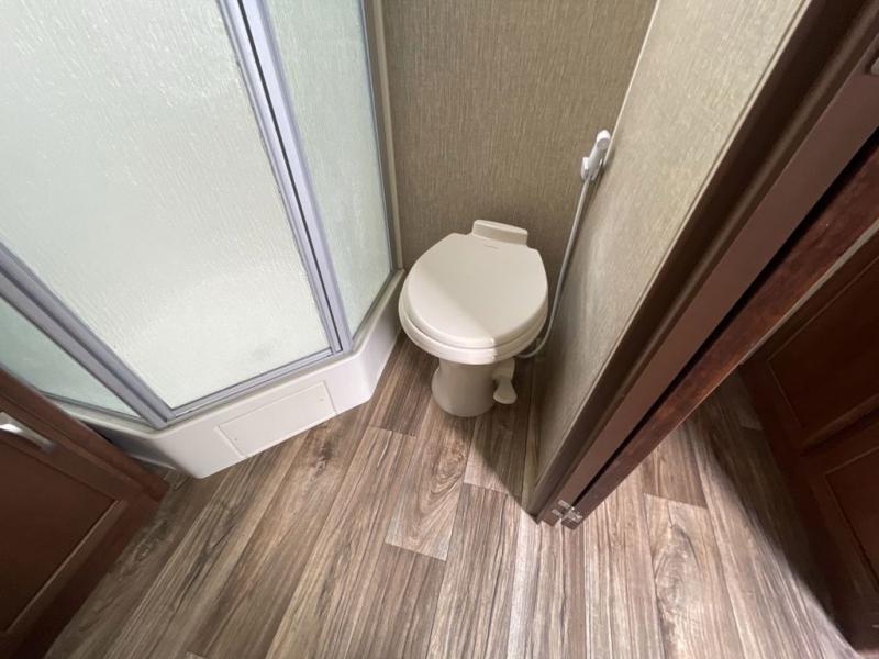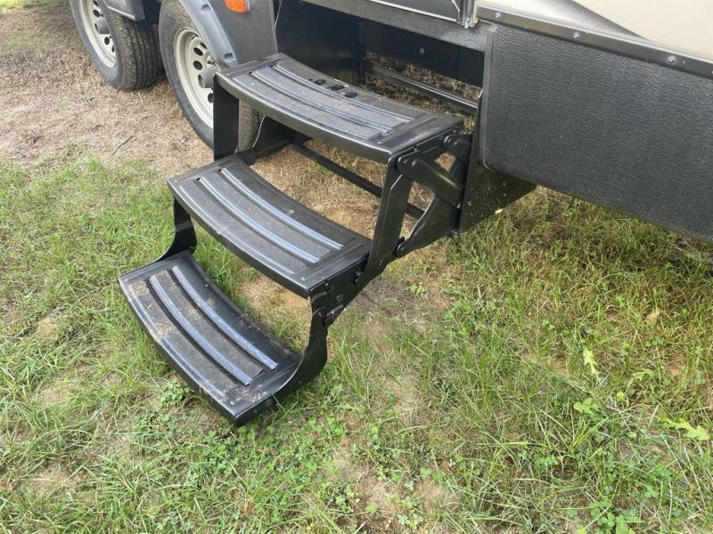 Enter the rear most entry door where you will find two chairs along the rear wall with an end table between, and overhead cabinets above the entire width of the space. Adjacent find a fold-down sofa with overhead storage, and u-shaped dinette slide which creates a wider interior to enjoy. There is a entertainment center along the interior living room wall that can easily be viewed by any of the seating in the room.