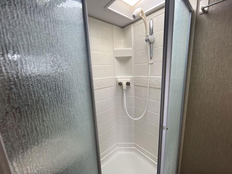 A second entry in the center of the unit leads into the living space heading left or to the front bedroom and side aisle bath. The bathroom features an angled shower, toilet and sink. There is a linen cabinet along the exterior wall across the hall.