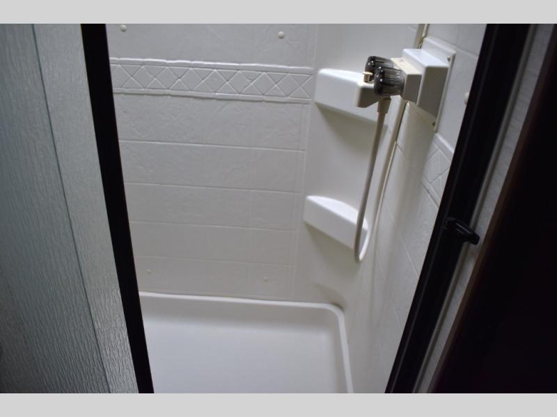 In the rear of this Premier unit you will find a compete bath with 30" x 36" shower including a glass door, toilet and sink, plus a large linen cabinet for toiletries and more.