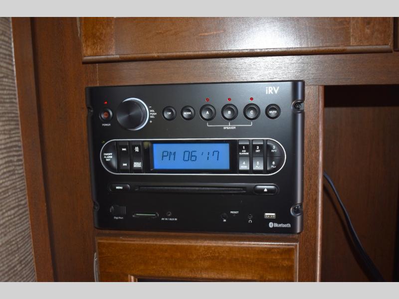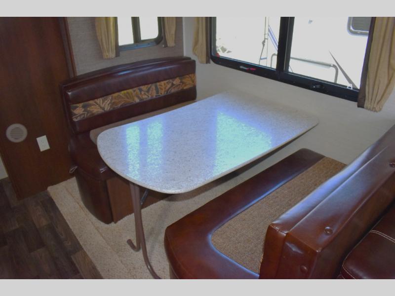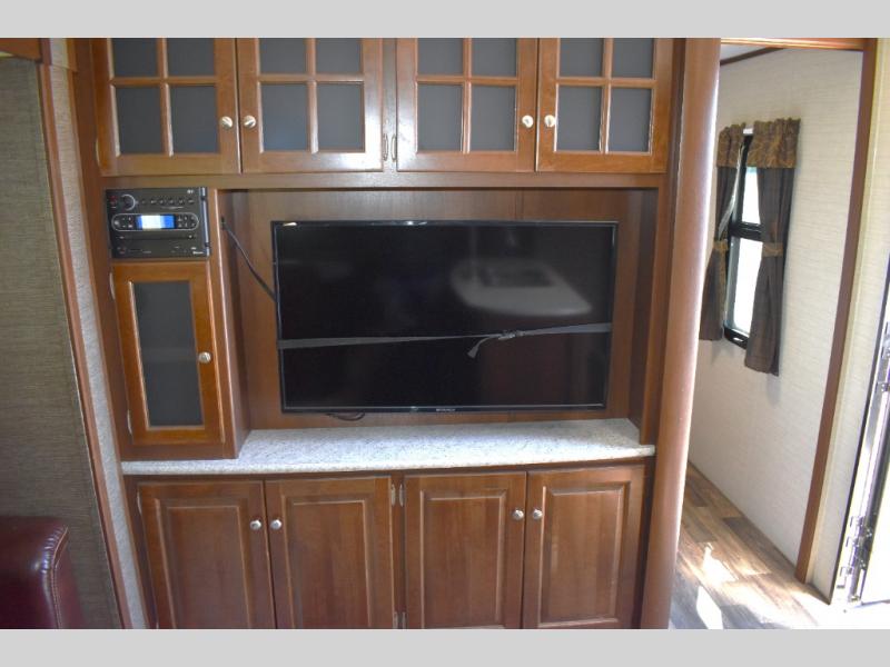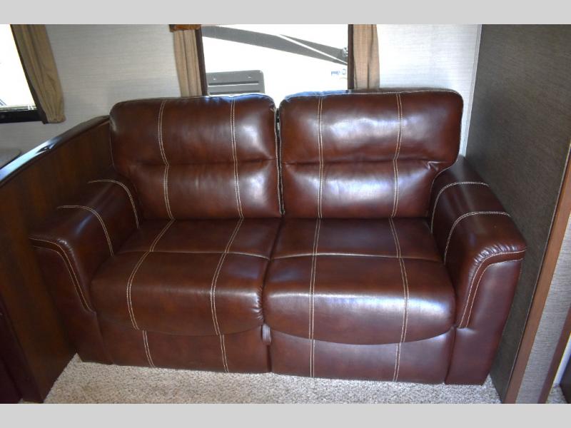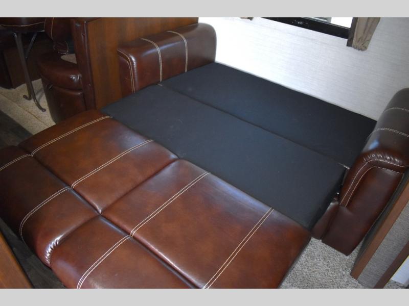 The opposite side features a tri-fold sofa and booth dinette. Both can be made into extra sleeping space at night and the sofa features overhead cabinets for storage. There is also an entertainment center on the interior wall that can be easily viewed from any seating in the room. A second smaller pantry is located off to the side of the dinette slide.