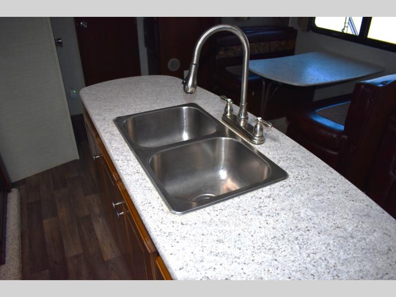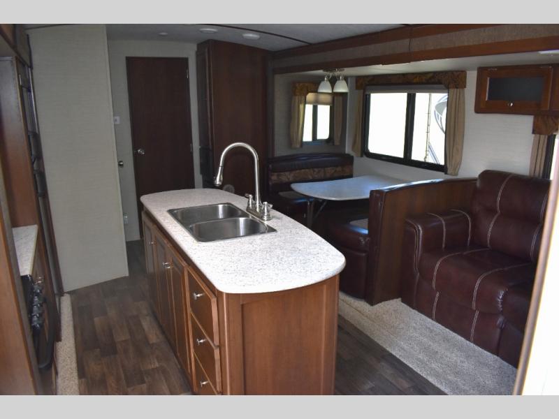 As you enter you will notice how open this unit feels with the combined kitchen and living space including two slides opposite one another. To the left of the entrance there is a slide out three burner range, counter area with overhead cabinet, and refrigerator. A large pantry off to the side provides ample space for storing dry goods and more. There is also a convenient kitchen island with added counter space and a double sink that will make cleanup a cinch.
