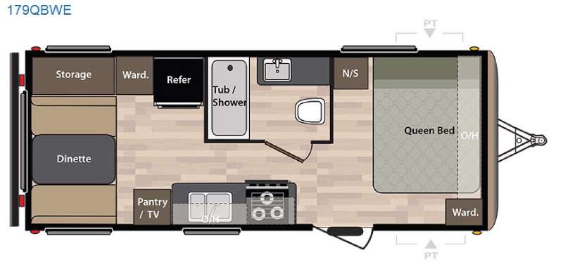 Step inside and find a queen bed in the front corner with overhead storage along the front wall. There is also a wardrobe and nightstand too.