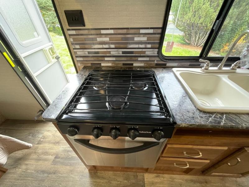 A full bath featuring a tub/shower, toilet, and vanity with sink is centrally located across from the kitchen area where you can cook light meals and snacks using a three burner range, sink, and pantry for storage. The refrigerator is opposite the kitchen along side of the bathroom.
