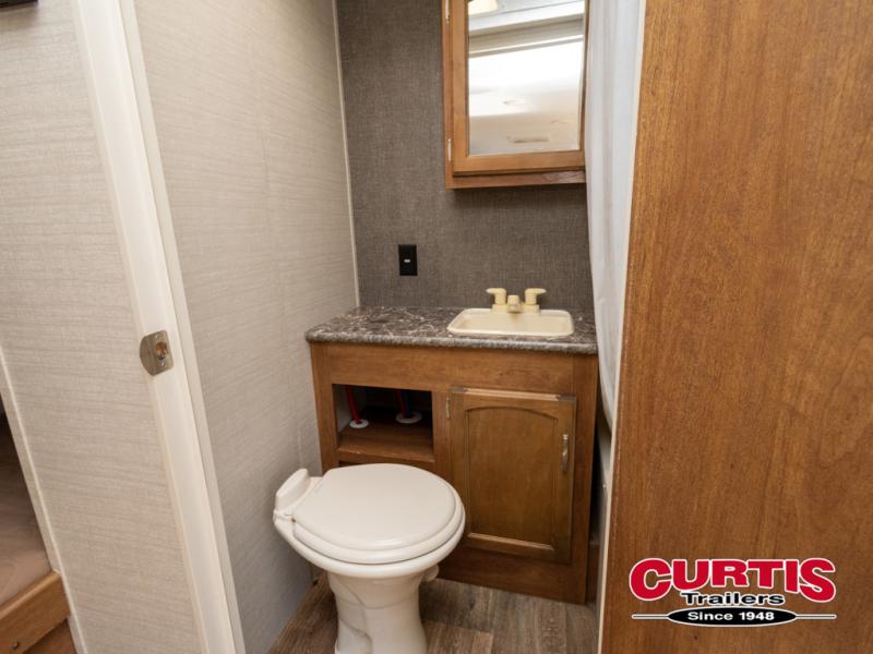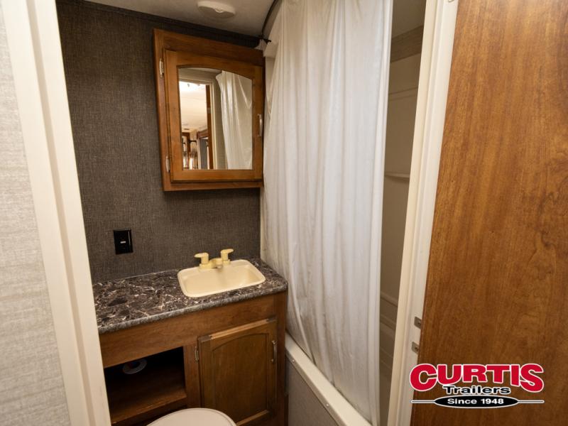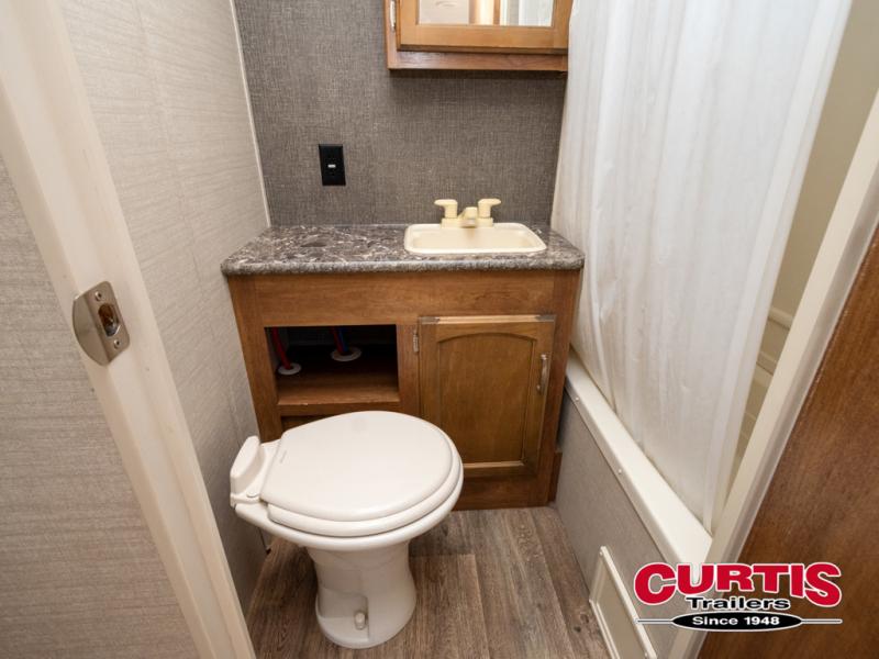 The rear of this Springdale features a set of bunks, and a rear corner bath with tub/shower, toilet, and vanity with sink.