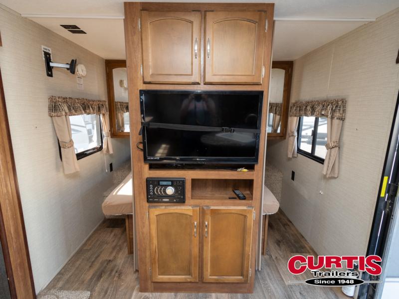 Step inside and notice the front bedroom area with queen bed and dual beside closets. You can pull the curtains closed on either side of the living room entertainment center for more privacy at night.