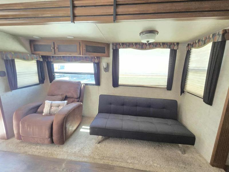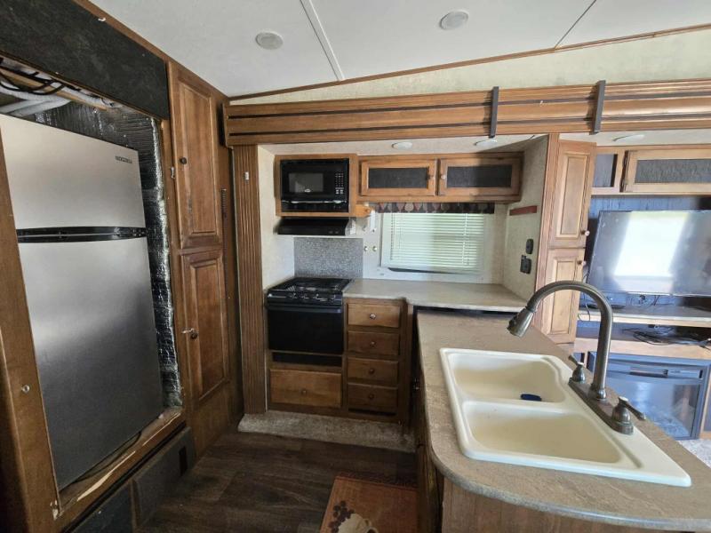 This wide body designed Keystone Sprinter fifth wheel model 289FWMLS offers a spacious interior with triple slides, a rear corner kitchen, and even a cozy fireplace!