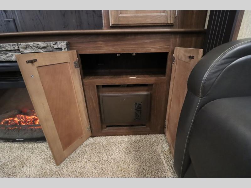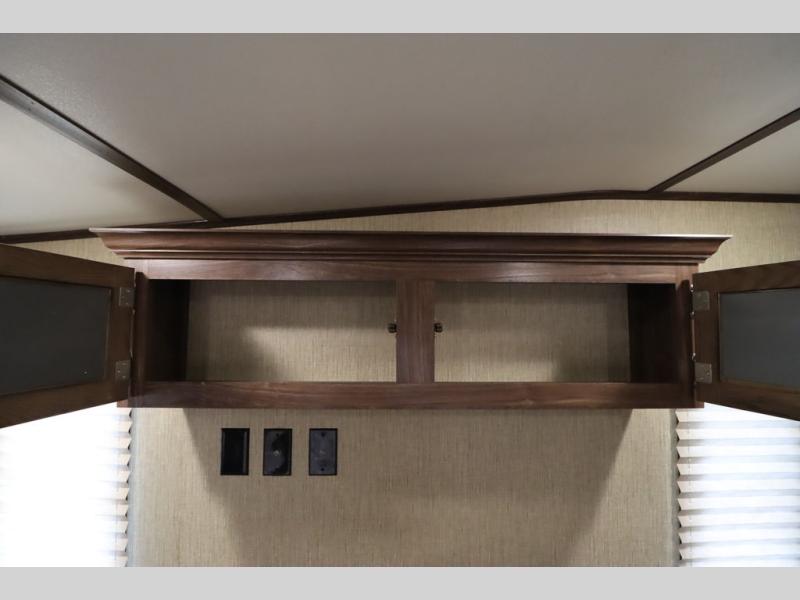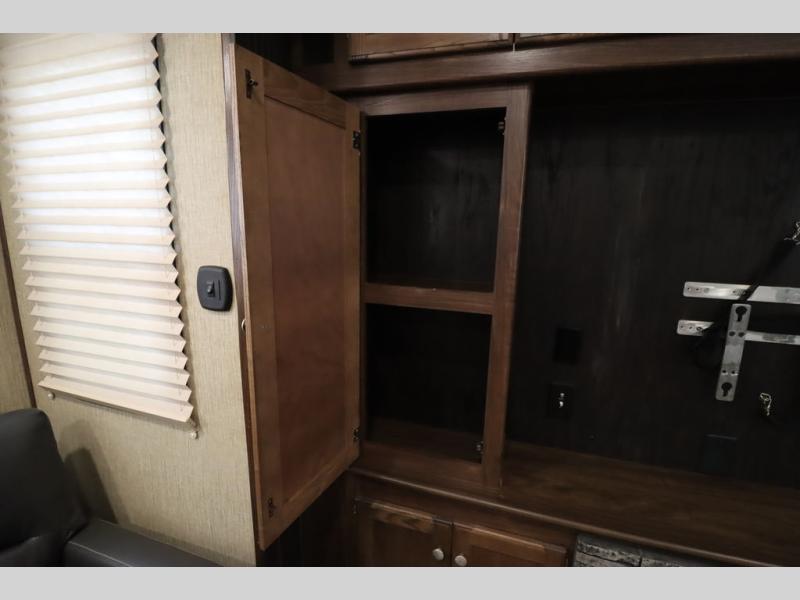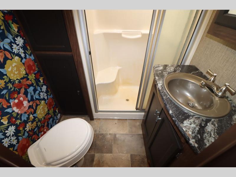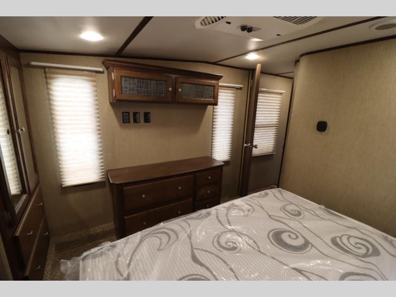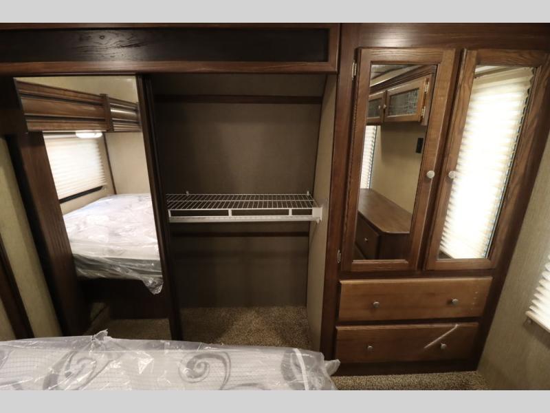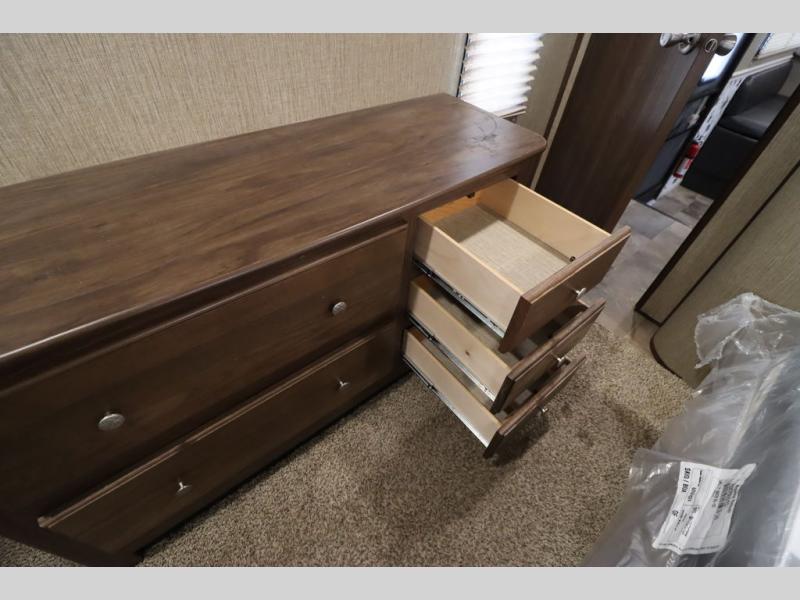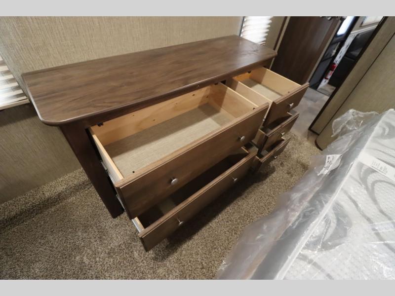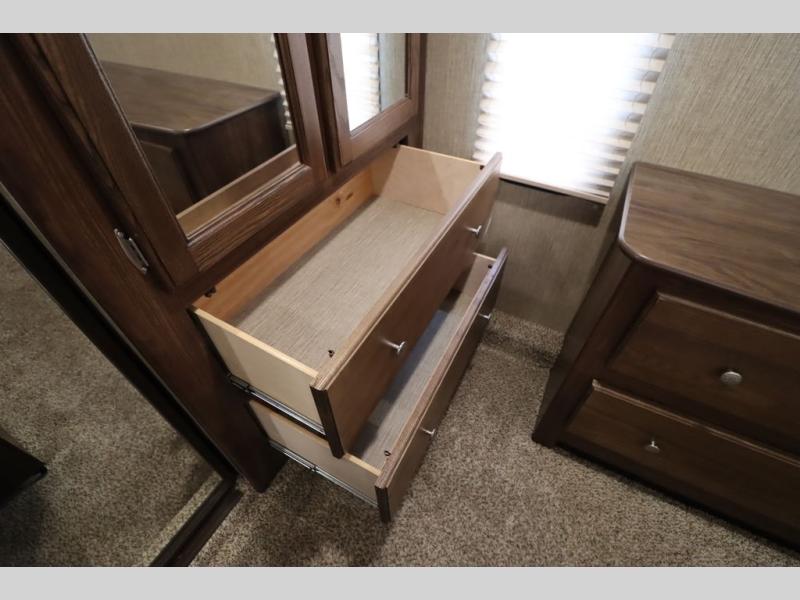 Enter model 353FWDEN and head up the steps on your right to the front master bedroom and side aisle bath. The bathroom offers a residential shower, toilet, sink, and linen cabinet. The private master bedroom at the end of the hall features a slide out residential queen size bed. There is also a dresser opposite, and full front wall wardrobe and closet for all of your clothing storage needs.