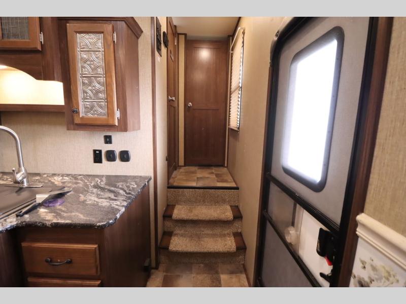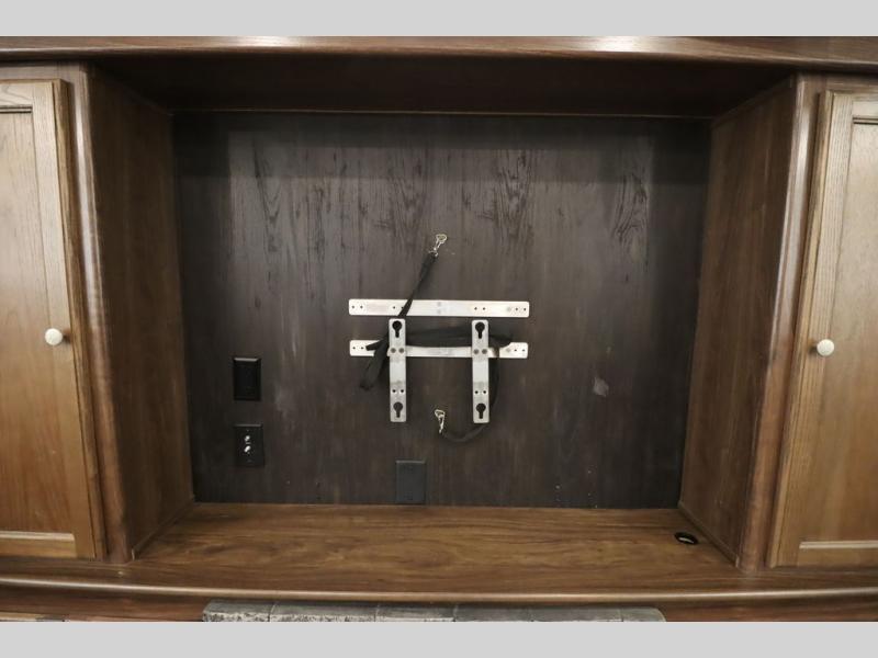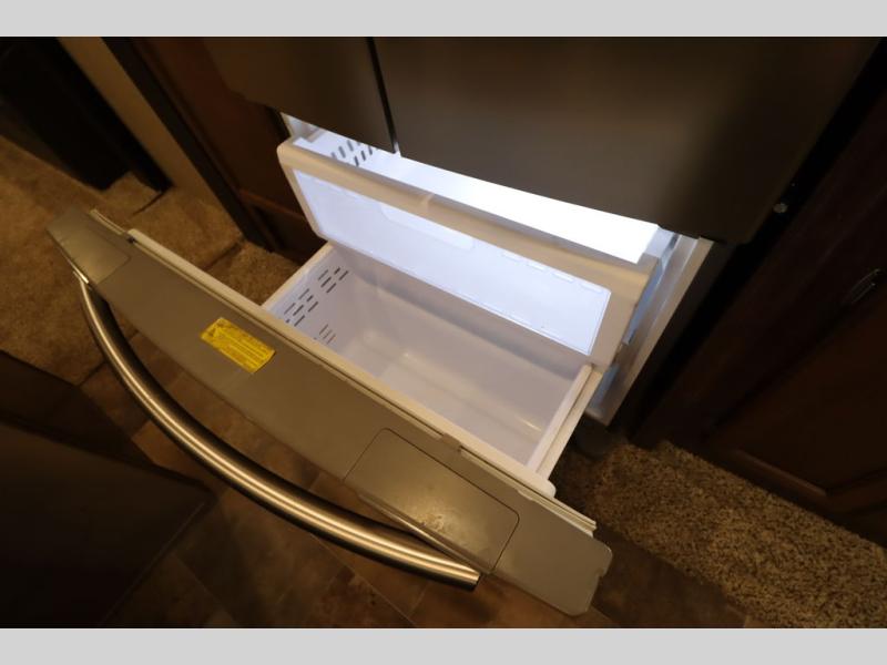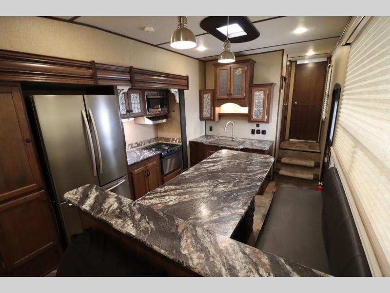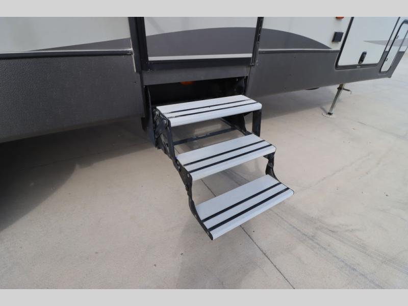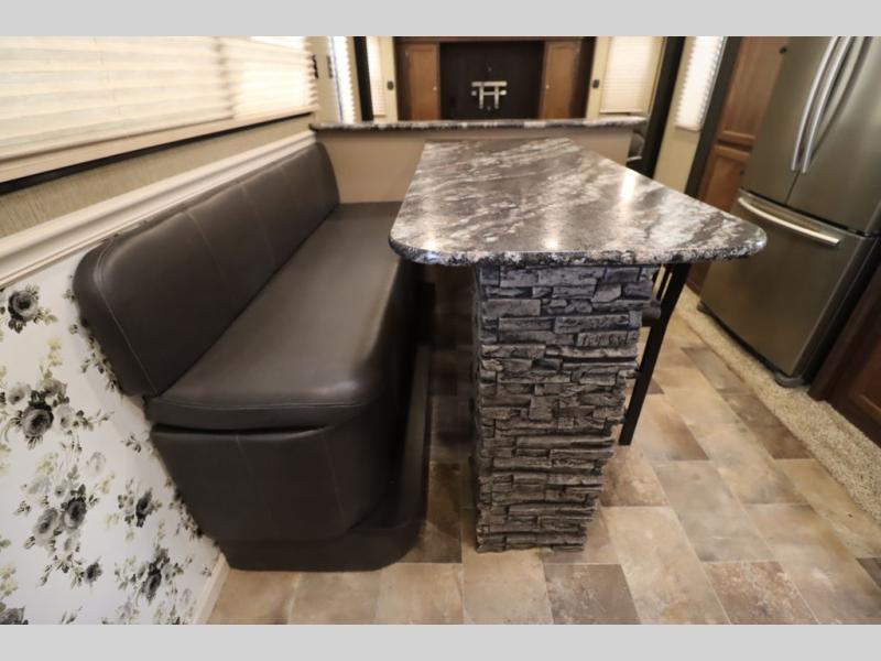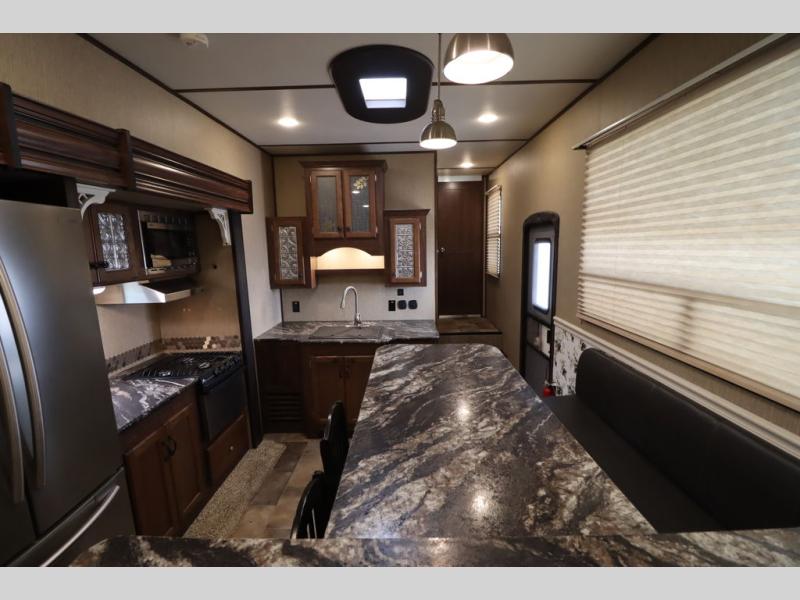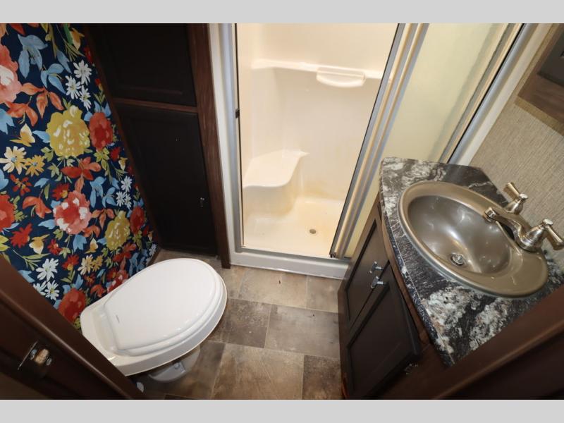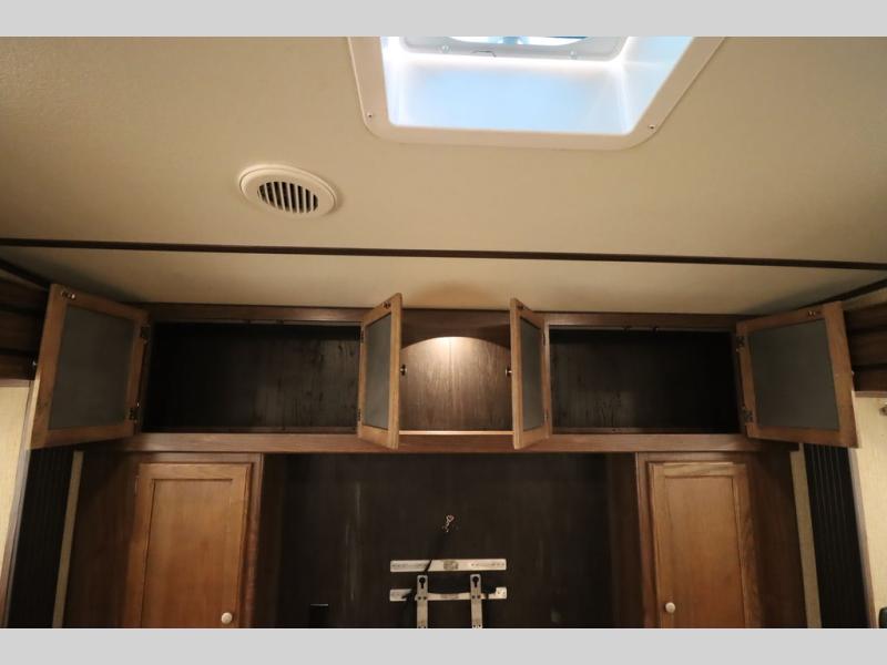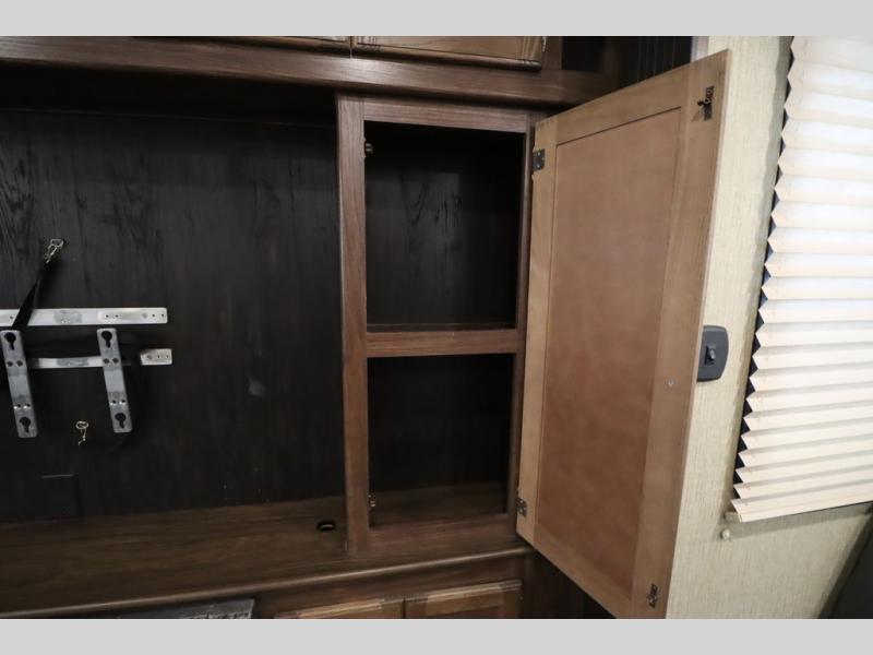 Enter model 353FWDEN and head up the steps on your right to the front master bedroom and side aisle bath. The bathroom offers a residential shower, toilet, sink, and linen cabinet. The private master bedroom at the end of the hall features a slide out residential queen size bed. There is also a dresser opposite, and full front wall wardrobe and closet for all of your clothing storage needs.
