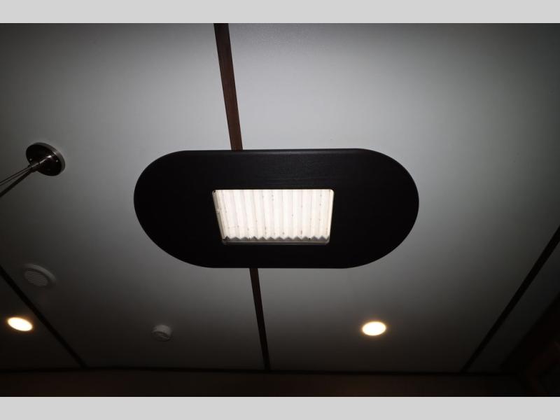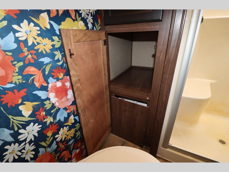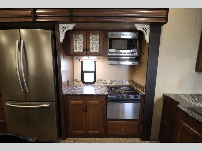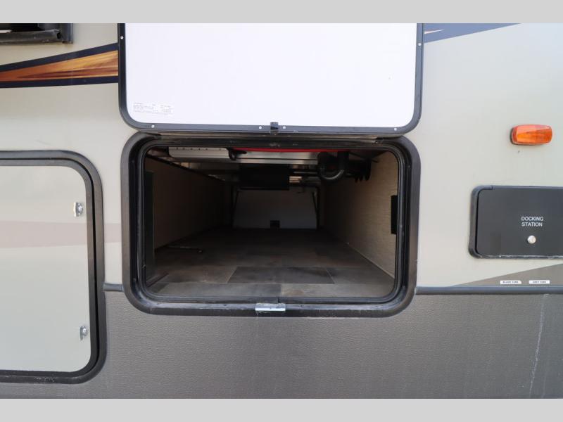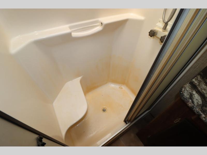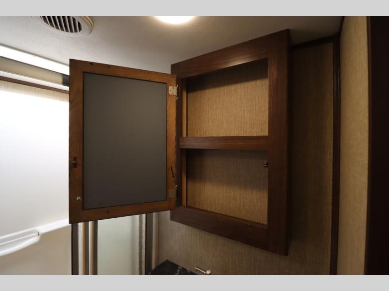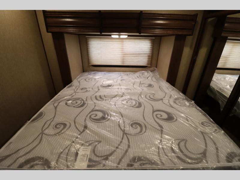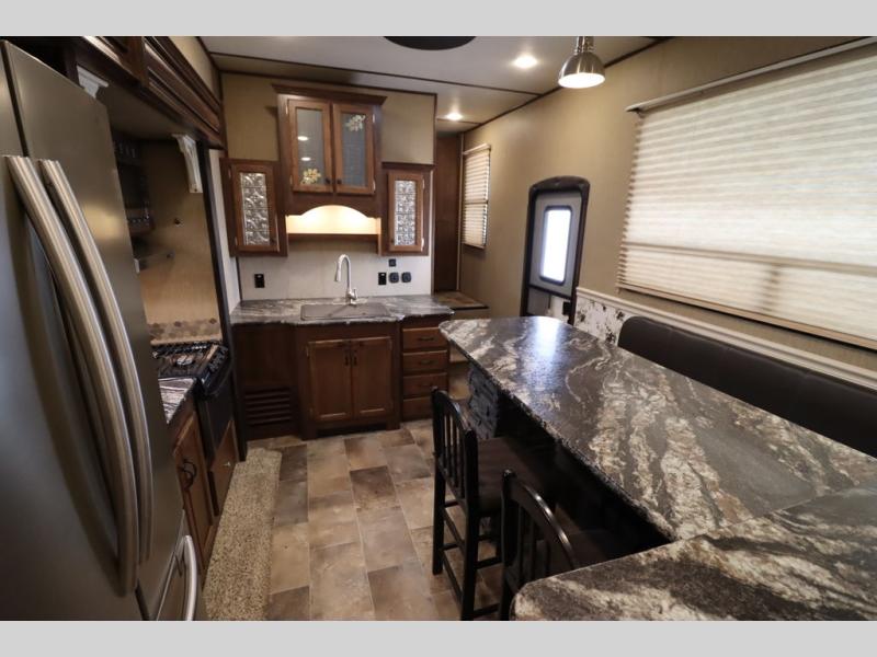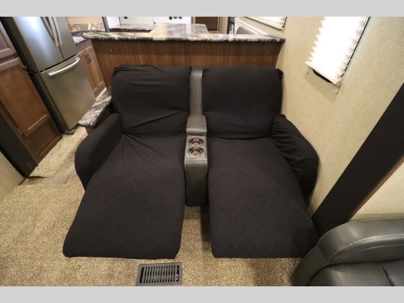 Enter model 353FWDEN and head up the steps on your right to the front master bedroom and side aisle bath. The bathroom offers a residential shower, toilet, sink, and linen cabinet. The private master bedroom at the end of the hall features a slide out residential queen size bed. There is also a dresser opposite, and full front wall wardrobe and closet for all of your clothing storage needs.