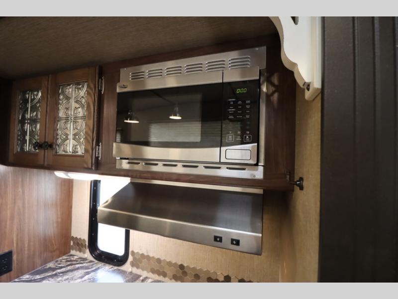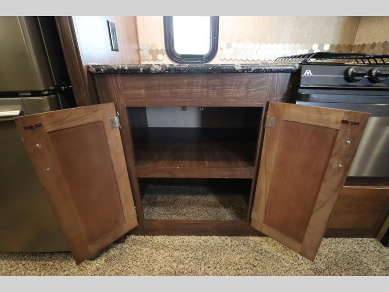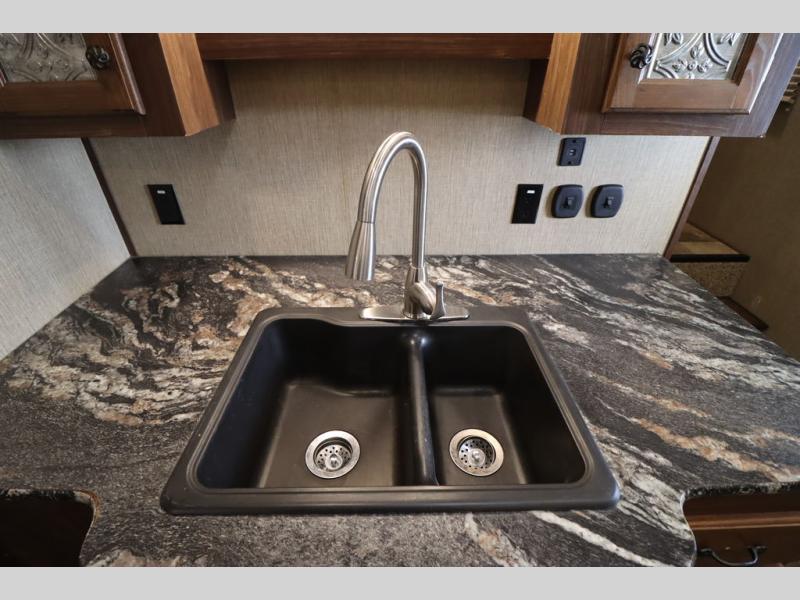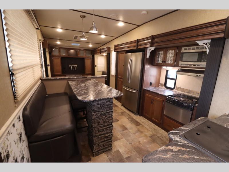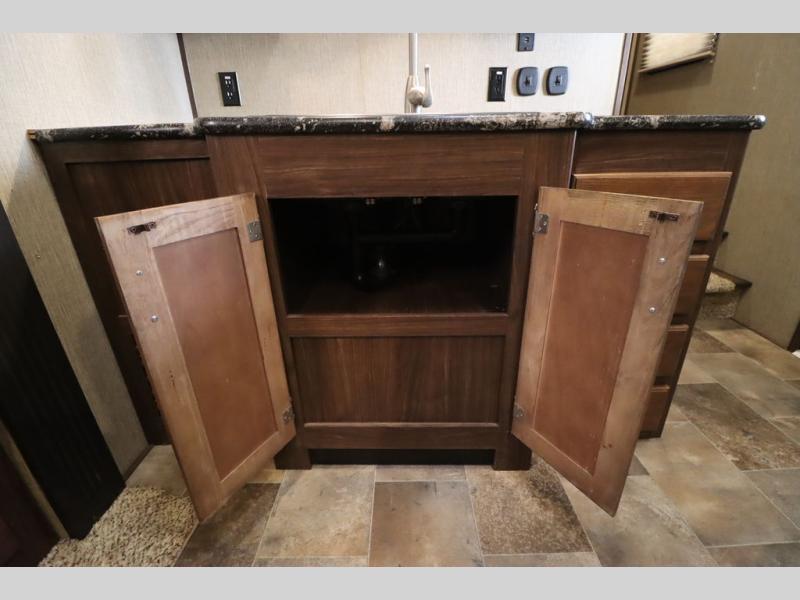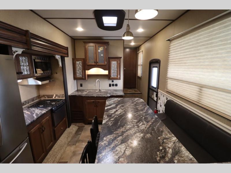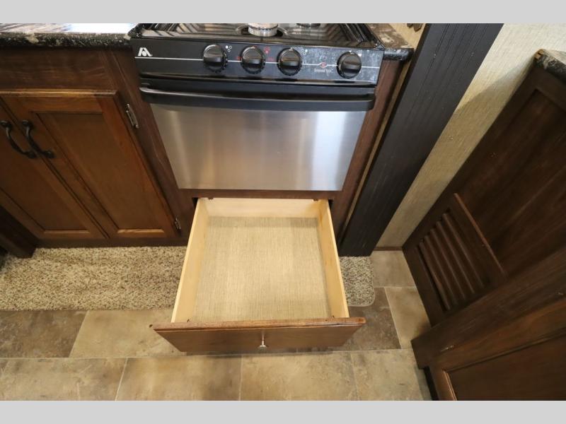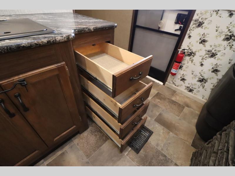 Heading towards the kitchen area you will find a dinette with booth seating along the curb side wall and three chairs on the opposite side. Along the interior wall is a double sink with counter space on both sides plus overhead storage for your dishes and things. The kitchen continues to provide everything you need to prepare and cook food for your family with a slide out three burner range, 18 cu. ft. residential refrigerator, and a pantry for your non-perishables.