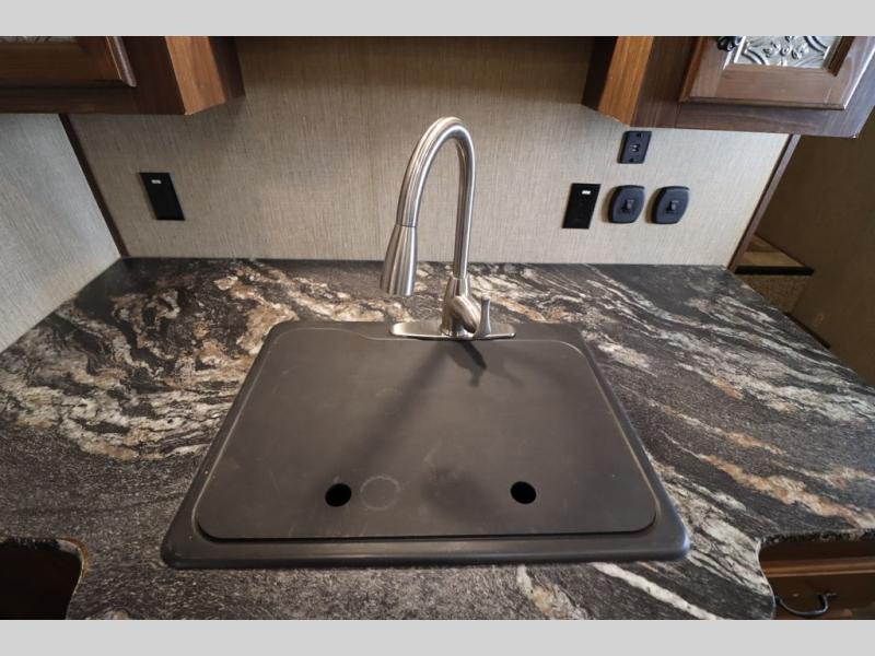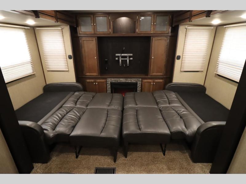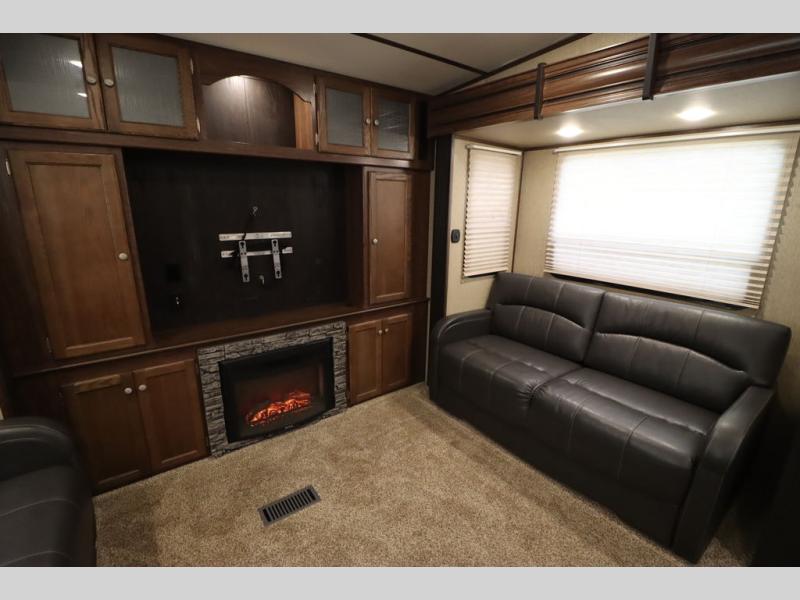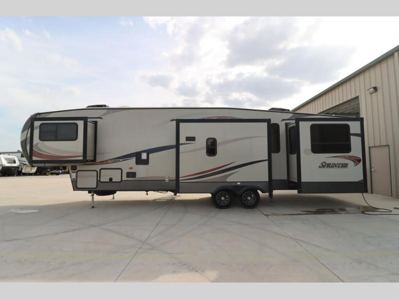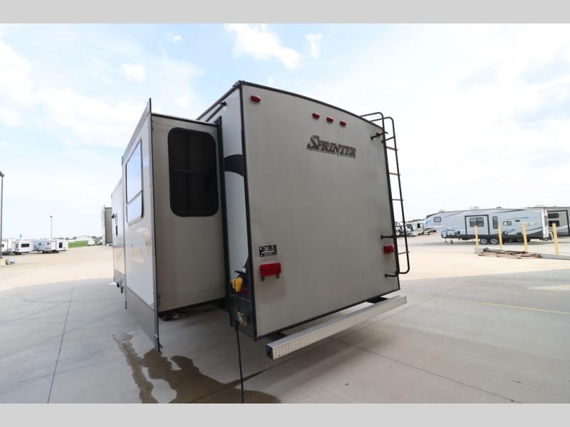 This Keystone Sprinter fifth wheel features a wide body design with quadruple slides which increases the size even more when all slides are fully extended. You are sure to love the den area with the rear entertainment center and fireplace.
