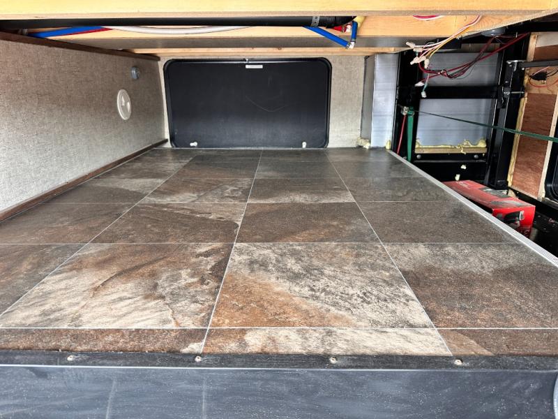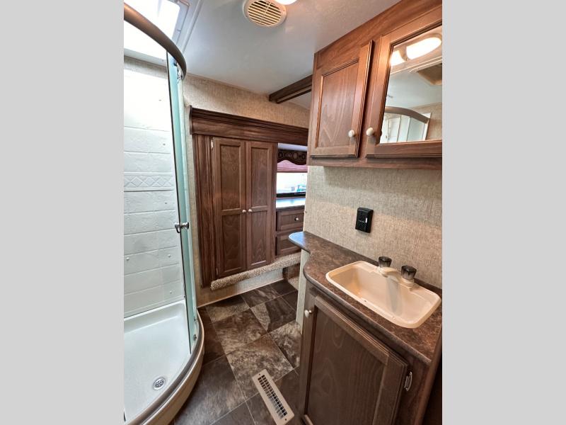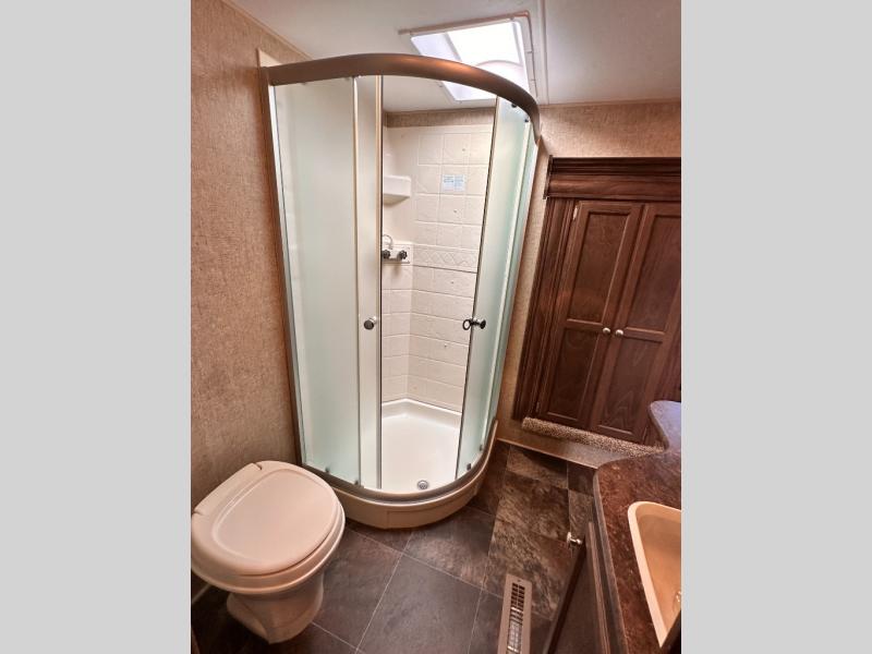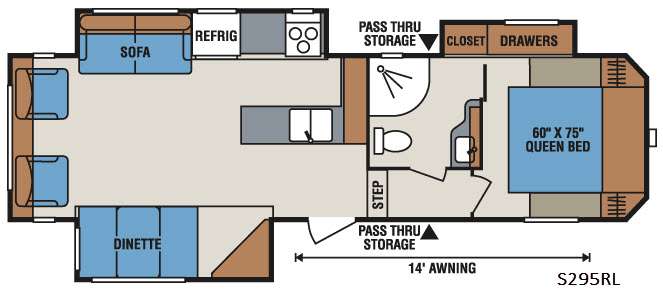The large exterior pass thru storage area comes in handy for packing and unpacking the outdoor gear. The 14' awning provides much needed shade on those sunny camping trips. There are many more features to enjoy in this fifth wheel!