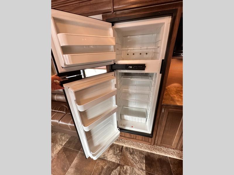 On the opposite side of the living area you will find a slide out with a sofa, refrigerator, counter space, and a three burner range. On the interior wall is more storage and counter space for prepping and cooking meals. A kitchen peninsula includes a double kitchen sink making this kitchen space a dream kitchen on wheels.