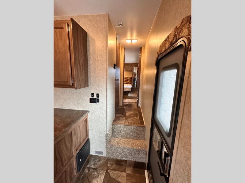 As you enter the KZ RV Sportsmen S285IK fifth wheel you will find two slides in the main living and kitchen area in this TRIPLE slide model.