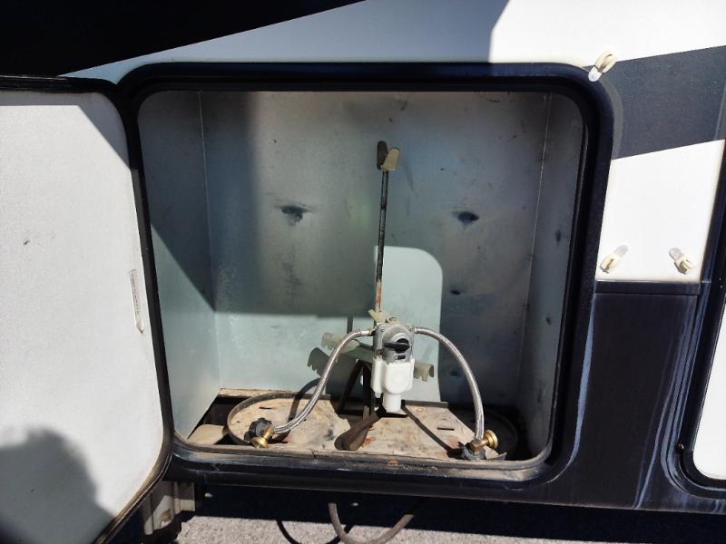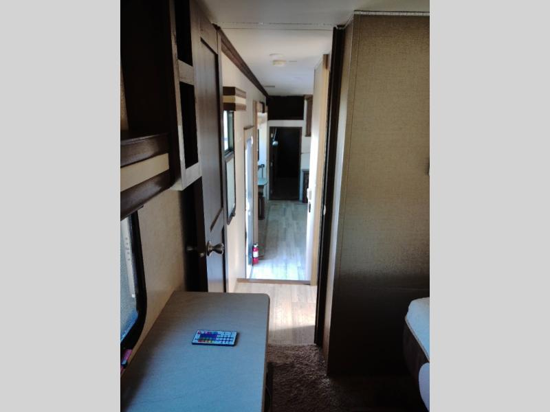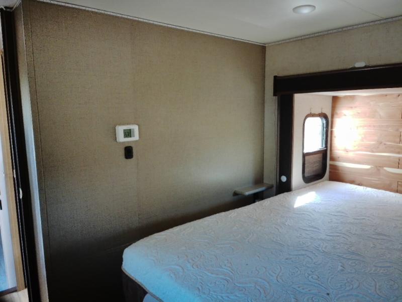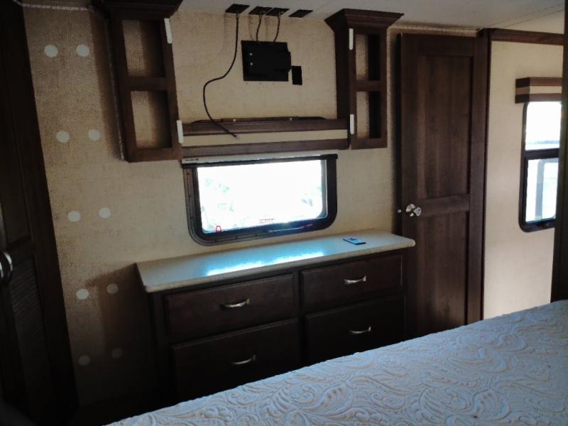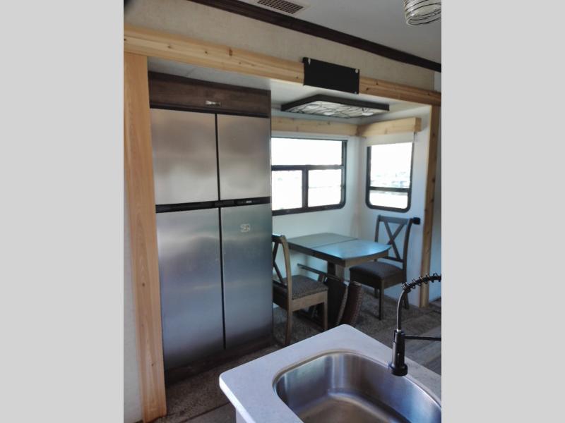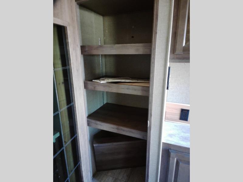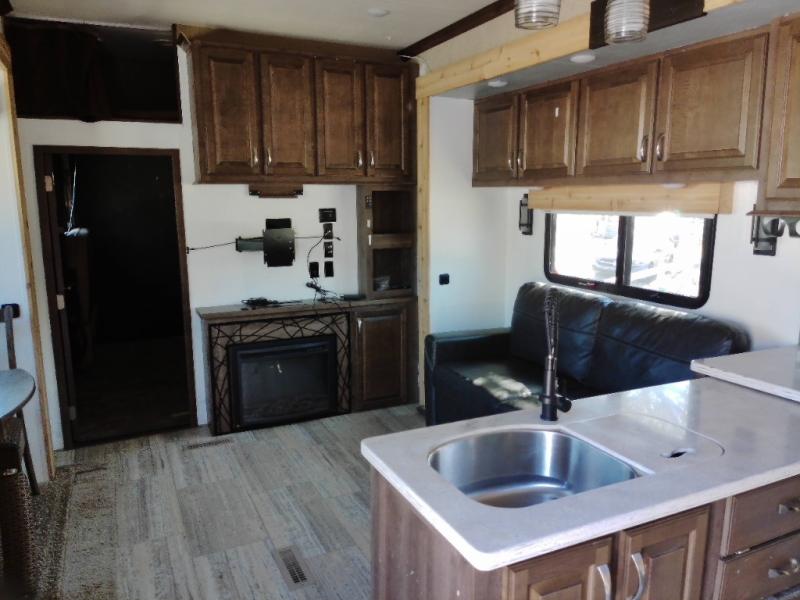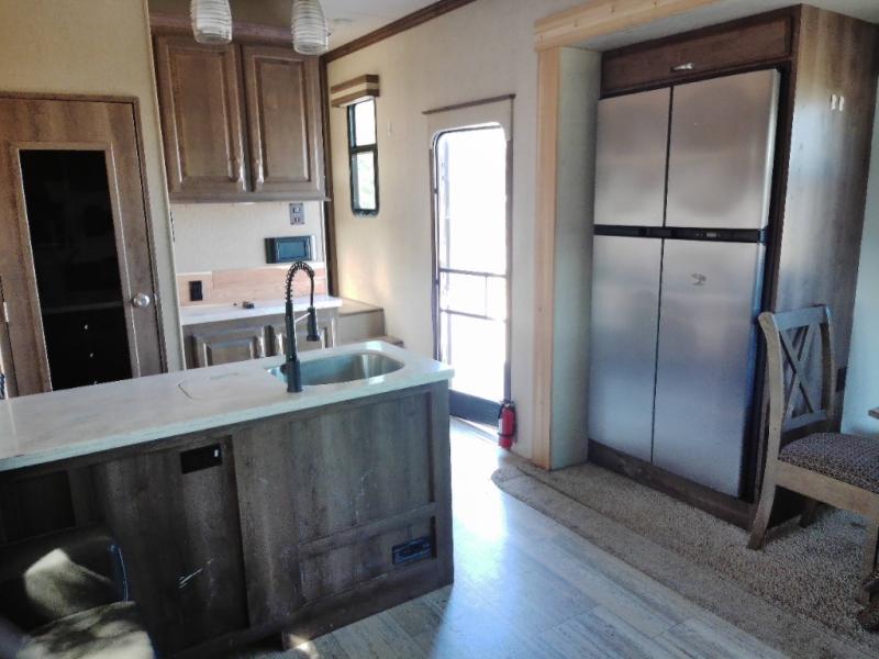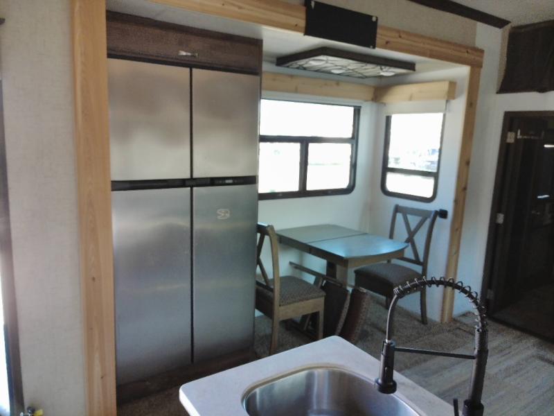 Step inside this fifth wheel and immediately notice how open and spacious the kitchen and living area are. With dual opposing slides you will have enough room to entertain a few guests. One slide has a refrigerator and table/chairs or you can choose optional theater seating in place of the table/chairs. On the opposite side there is a slide with a l-shaped hide-a-bed, counter with a double kitchen sink, three burner range, and overhead cabinets. The pantry is quite large, and next to the pantry there is a hutch. Along the rear wall you will find an entertainment center which is sure to bring enjoyment. Also along the rear wall there is access to the loft bed.