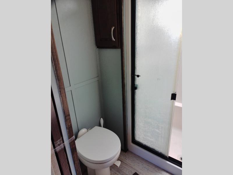 Proceeding back toward the front of the fifth wheel, step up two stairs and find the bathroom on the left side. Inside the bathroom there is a toilet, shower with seat, sink, and medicine cabinet.