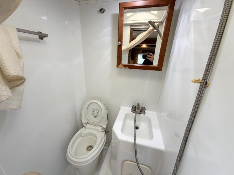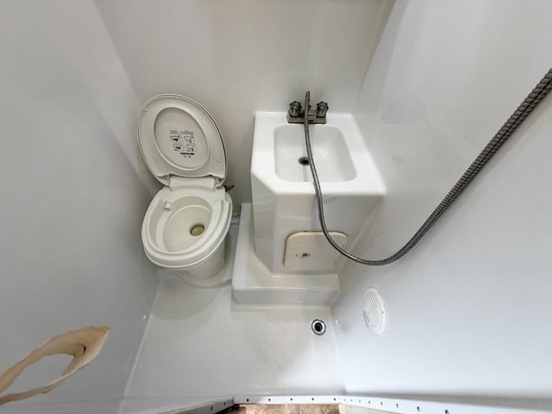 As you step inside you will find a convenient wet bath including a shower, toilet and sink. There is a wardrobe for storage just outside the bath door.