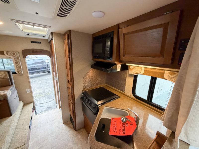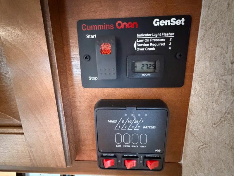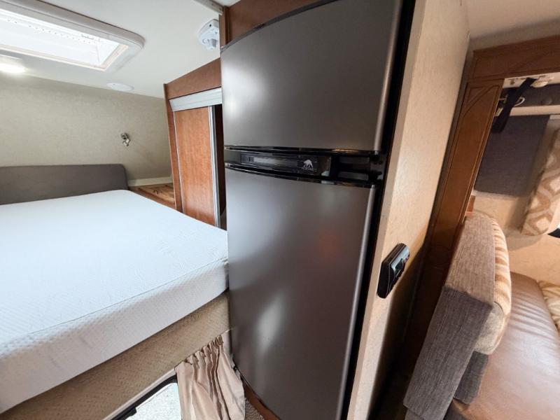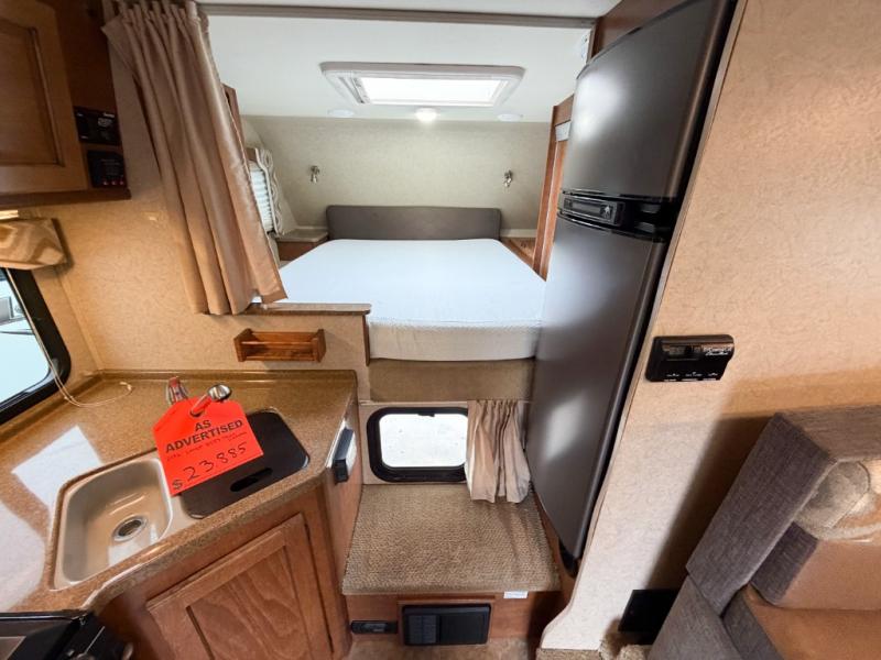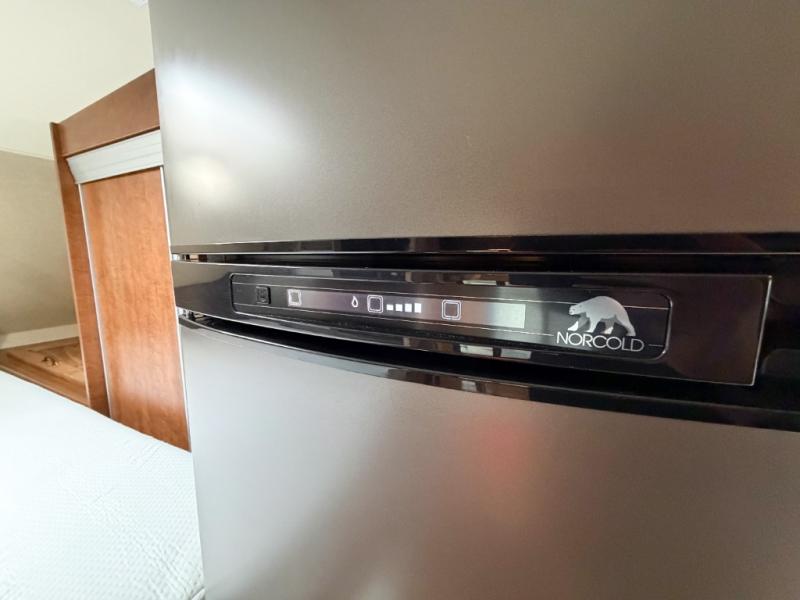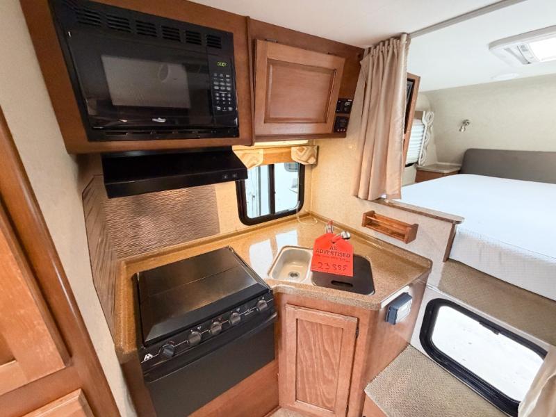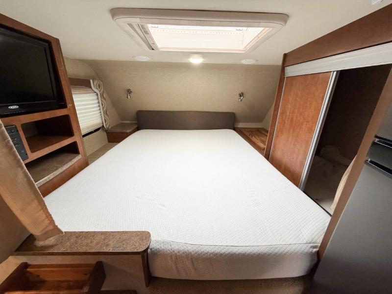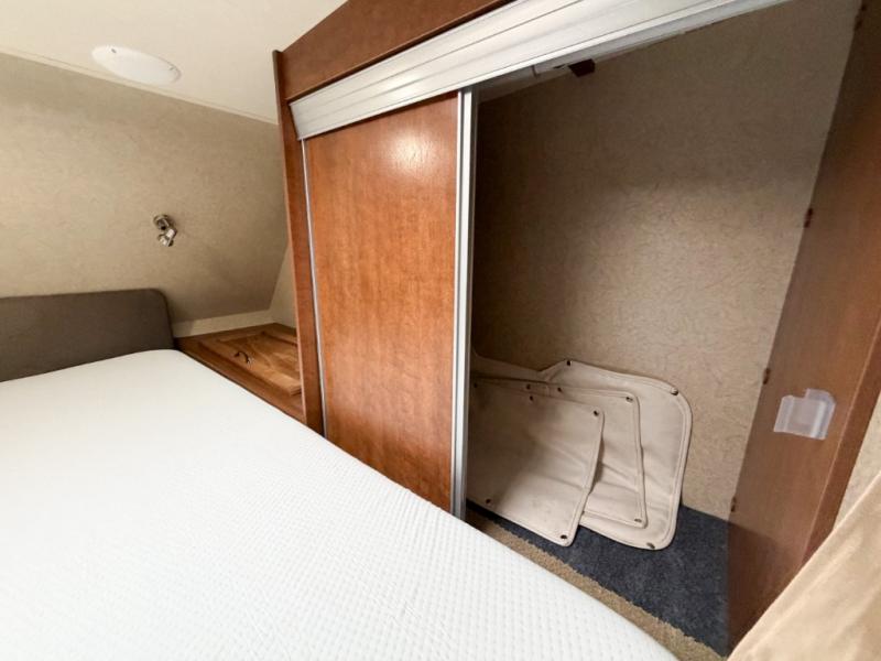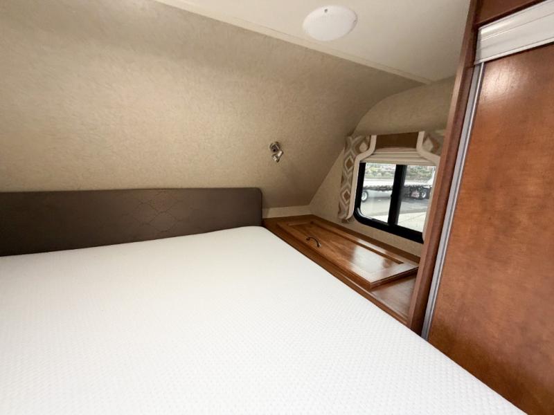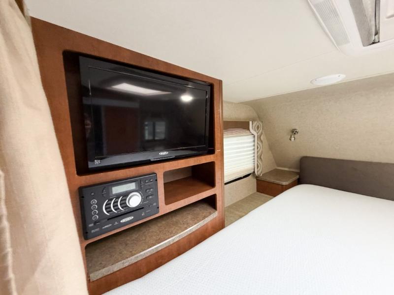 Step up to a queen cabover bed with a large storage cabinet on the right. There is a hamper also on the same side to help keep things neat and tidy. On the left enjoy an entertainment center in the rear corner, plus a front cabinet for storage on that same side. You can add an optional 24" 12 Volt LED TV for your enjoyment as well.