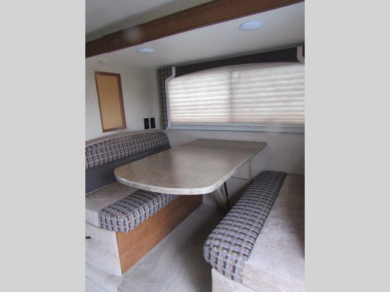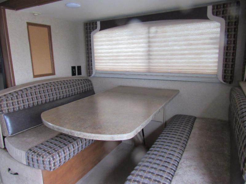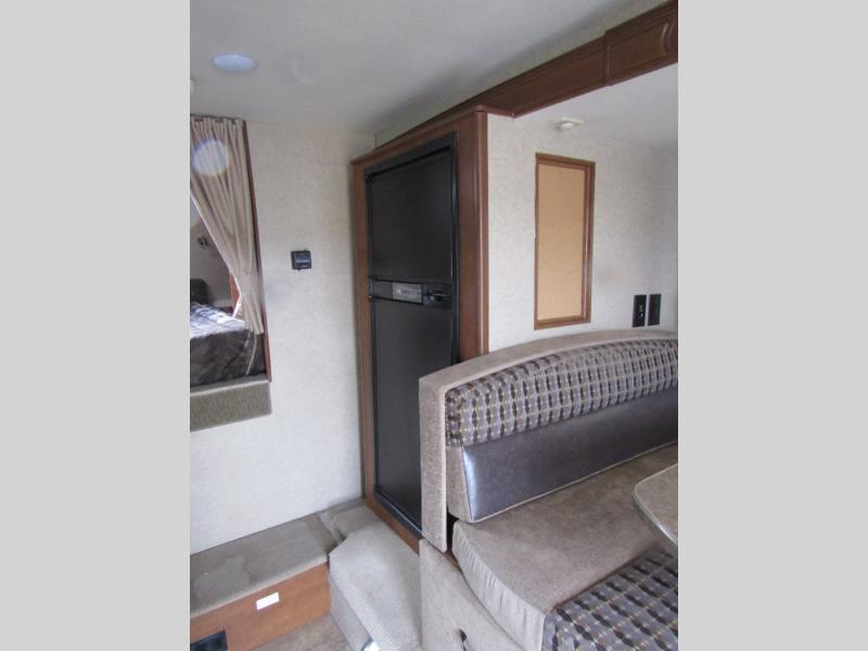 Along the rear notice the storage for your exterior camping gear. As you step inside this model you will find that there is a slide out booth dinette and refrigerator on your right.