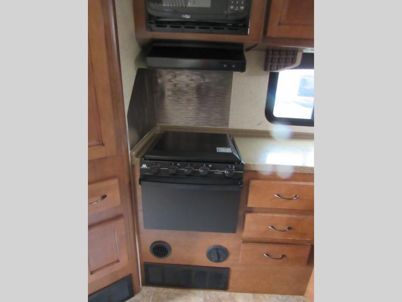 Outside the bathroom along the left side is the kitchen area where you can easily cook up meals and snacks while you camp. There is a pantry for dry good storage, a three burner range, a double sink, overhead storage, and a trash can. You can add a microwave oven if you like, or slide out pantry.