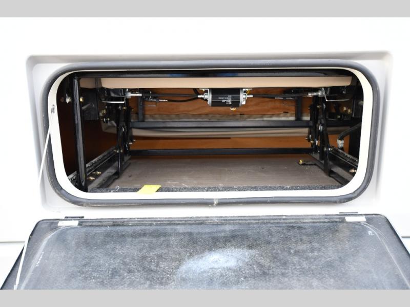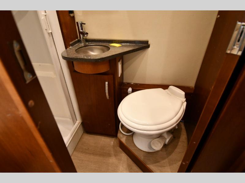 The rear left corner offers a standard 54" x 80" bed with storage across the head of it, and along the curb side wall. The right rear corner features a complete bath with shower, sink, toilet, and storage, plus so much more!