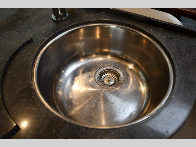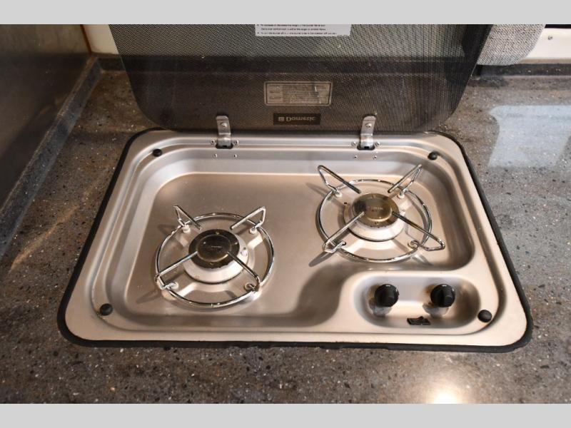 To the left of the entry door find a wardrobe for clothing, a refrigerator next, and a pull-out pantry for storage all along the curb side wall. Opposite find a counter with round sink, a range top and overhead storage, plus more storage in the cabinets and drawers below.