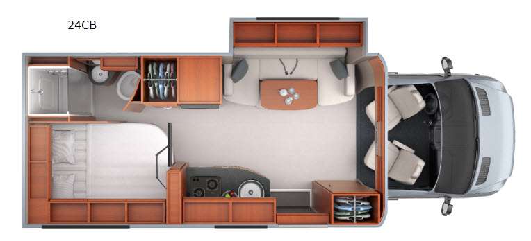 Inside this 24CB Unity model you will quickly see just how convenient your next camping trip could be. The front driver and passenger seats swivel to the rear for added seating when parked. There is a slide out booth dinette, or optional u-dinette, with seat belts for safety while moving down the road, and overhead storage as well.