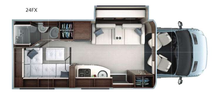 This Leisure Travel Unity model 24FX offers a totally customizable class B+ coach. You will have all the space you need to entertain and enjoy time with family and friends with a slide out booth dinette up front, and with the L-shaped residential style sectional in back.