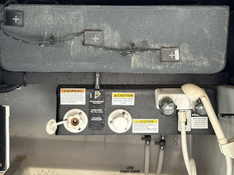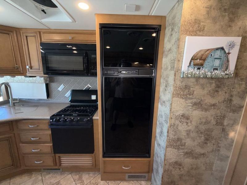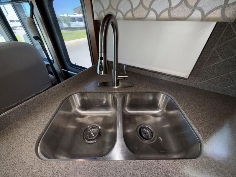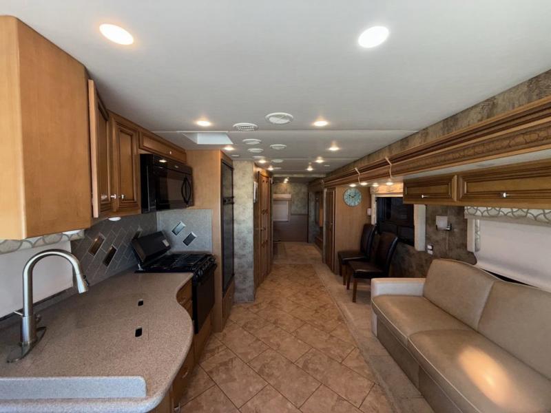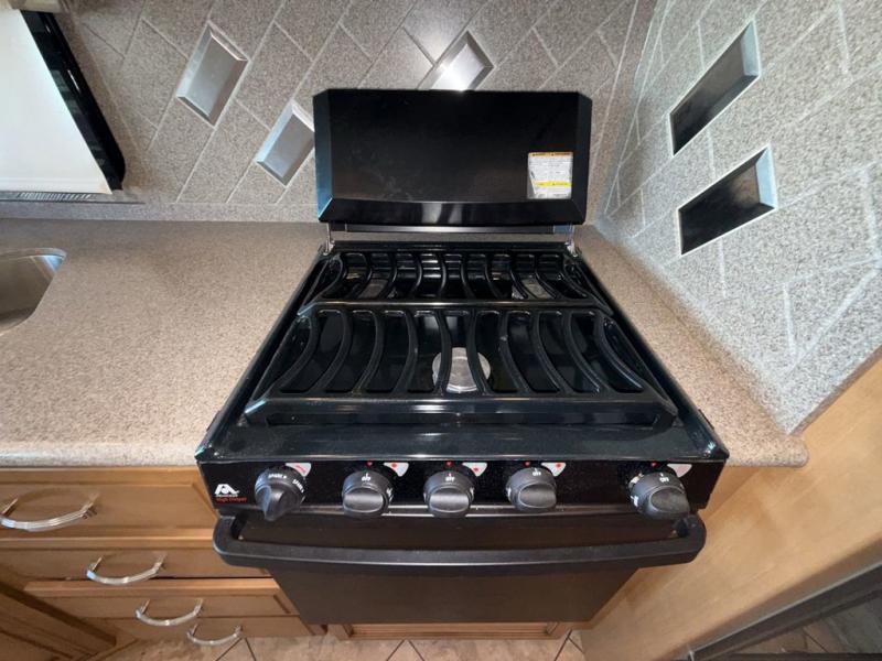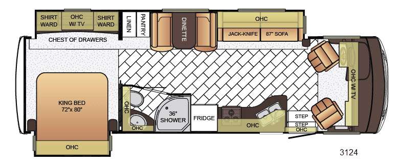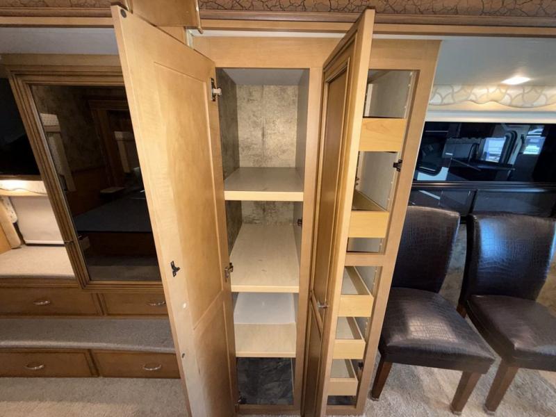 As you enter the motor home, to the left is a double kitchen sink, three burner range, and refrigerator. Meal prep and clean up is a breeze with this kitchen! The opposite side of the motor home has a full wall slide with a 87" sofa, dinette, pantry, linen cabinet, and in the bedroom the slide continues with two shirt wardrobes, a chest of drawers, and an overhead TV in the bedroom.
