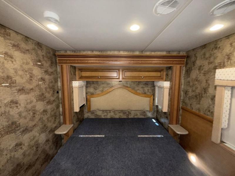 The bedroom, across from the shirt wardrobes and chest of drawers you will find a slide with a king bed and an overhead cabinet above the bed. There are also nightstands on either side of the bed.