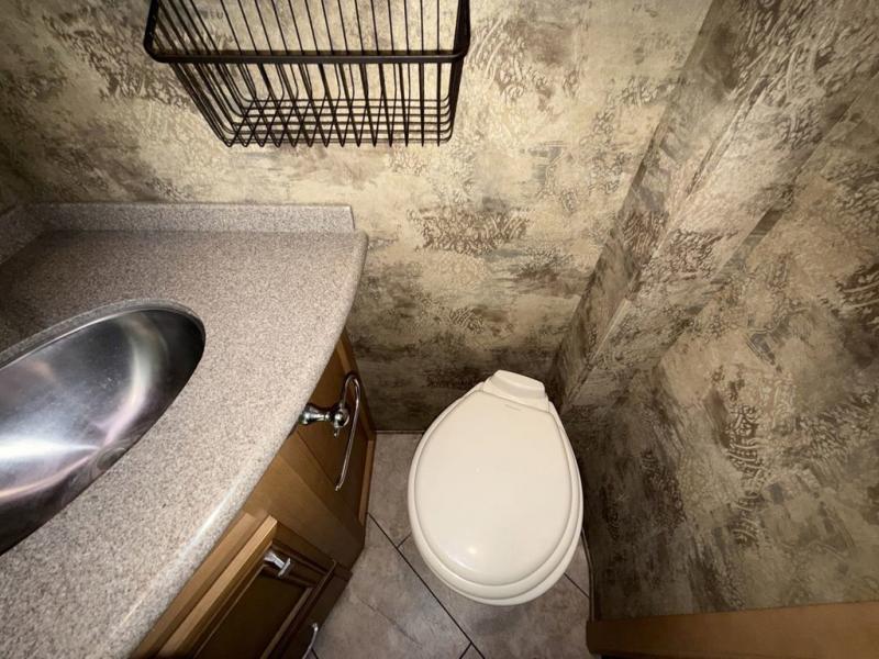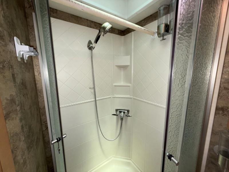 As you leave the bedroom, the side aisle bathroom has a toilet, sink, corner shower, and overhead cabinets.