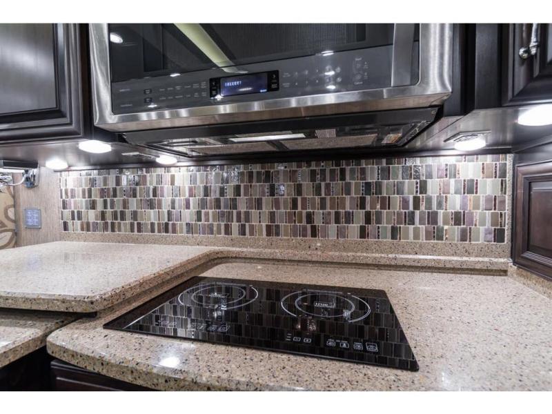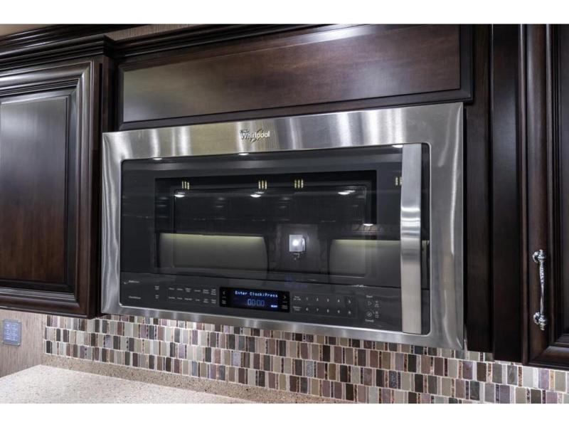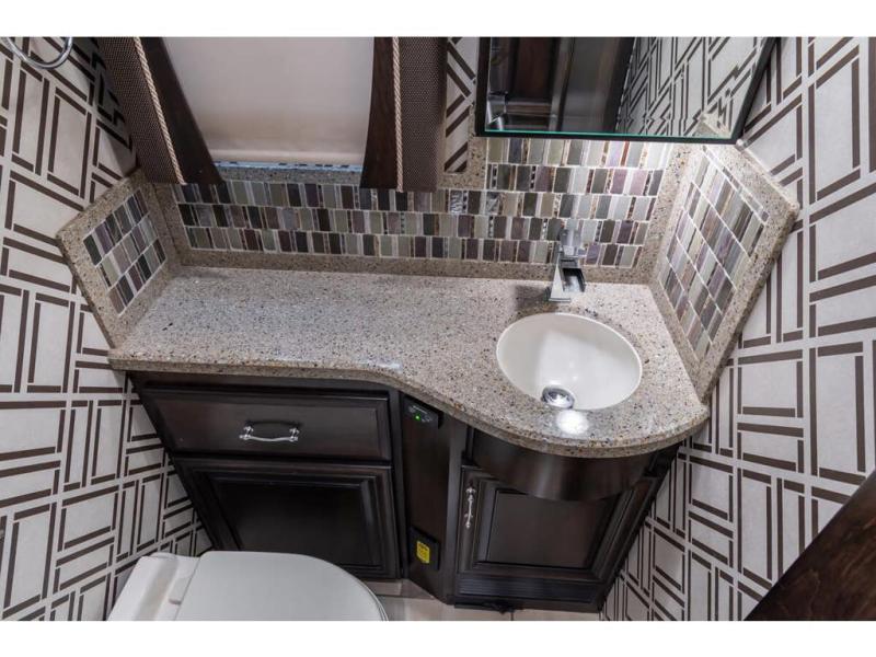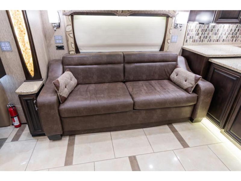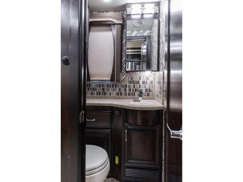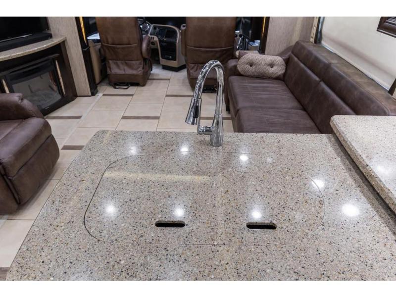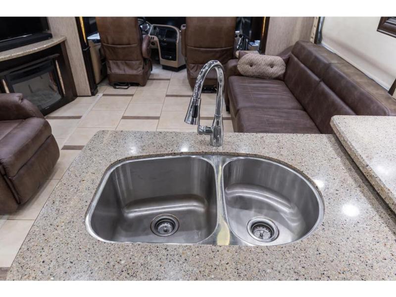 Inside this motor home find plenty of space in the main living area thanks to the full wall slide along the roadside, and the slide along the door side. The door side slide has a 84" hide-a-bed sofa, l-shaped counter with a double kitchen sink, two burner range, and next to the range you will find a pantry. There is also a large overhead cabinet above this slide for extra storage. Just past the slide you will find a half bath.