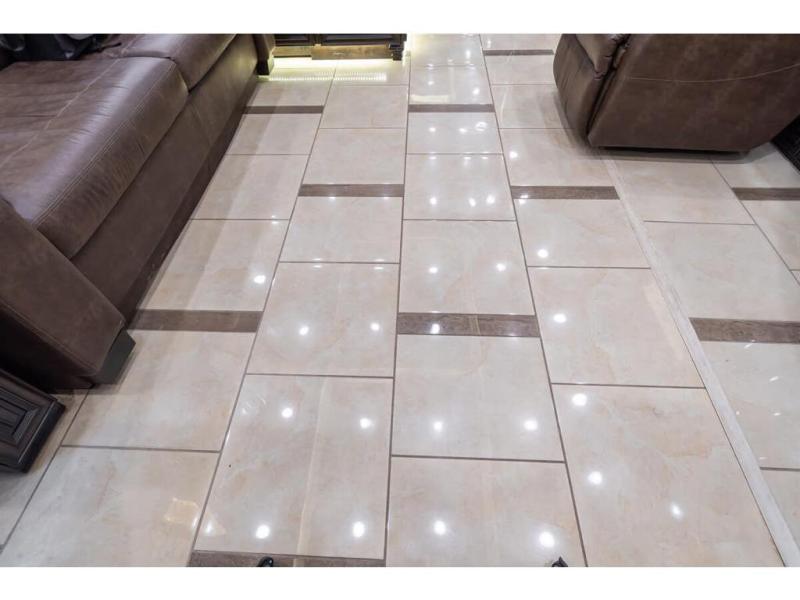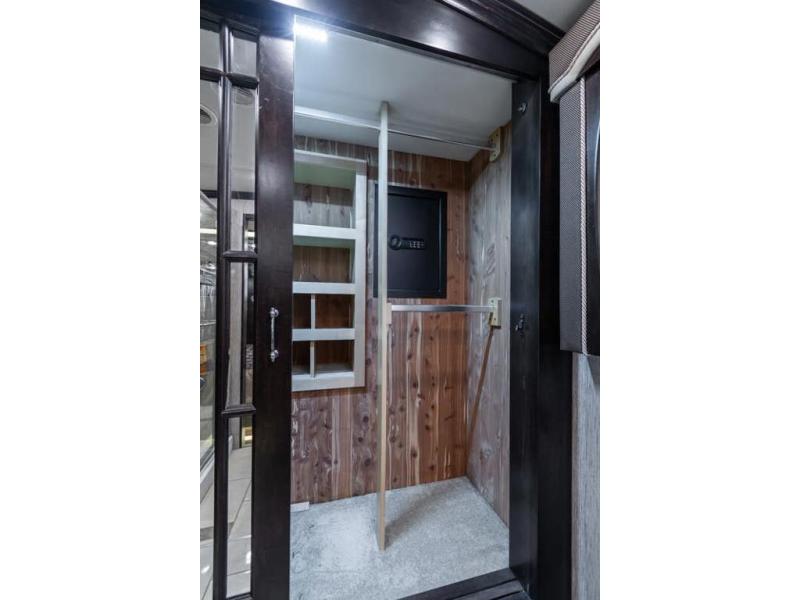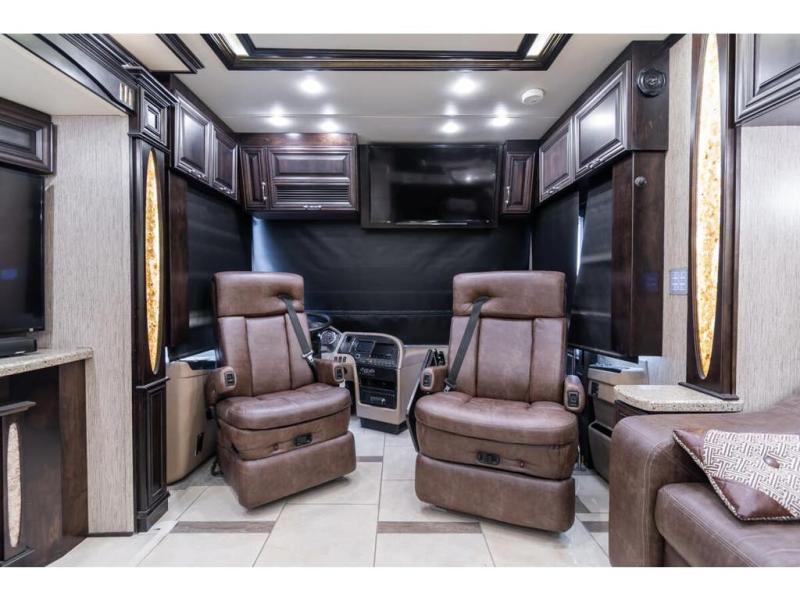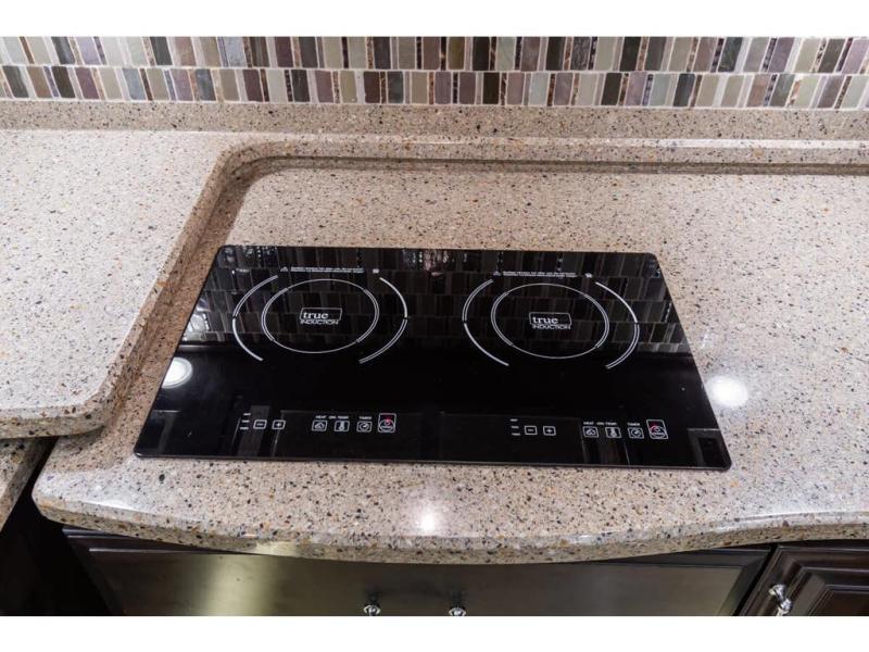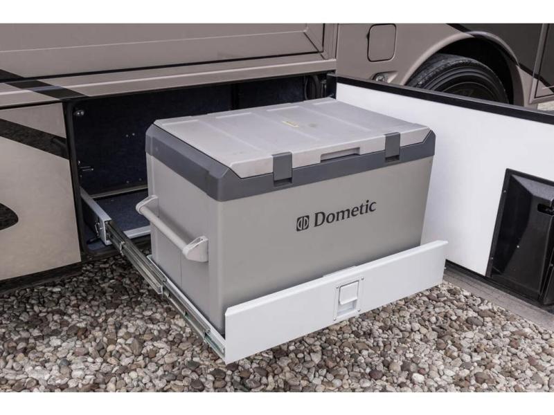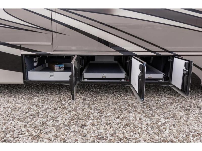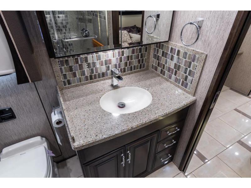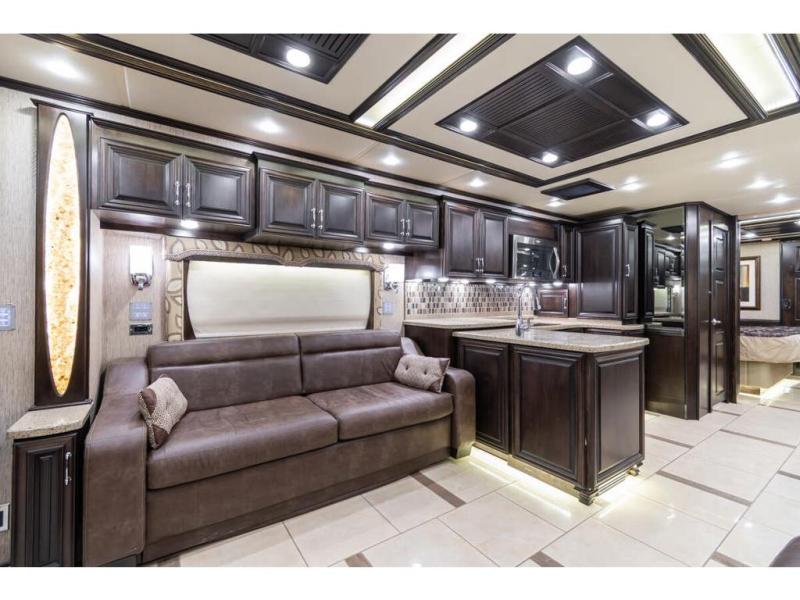 Inside this motor home find plenty of space in the main living area thanks to the full wall slide along the roadside, and the slide along the door side. The door side slide has a 84" hide-a-bed sofa, l-shaped counter with a double kitchen sink, two burner range, and next to the range you will find a pantry. There is also a large overhead cabinet above this slide for extra storage. Just past the slide you will find a half bath.