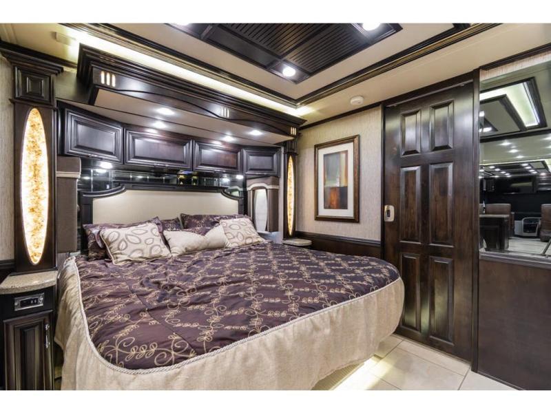 In the bedroom, across from the drawers, you will find a slide with a king bed, nightstands on either side of the bed, and an overhead cabinet above the bed.